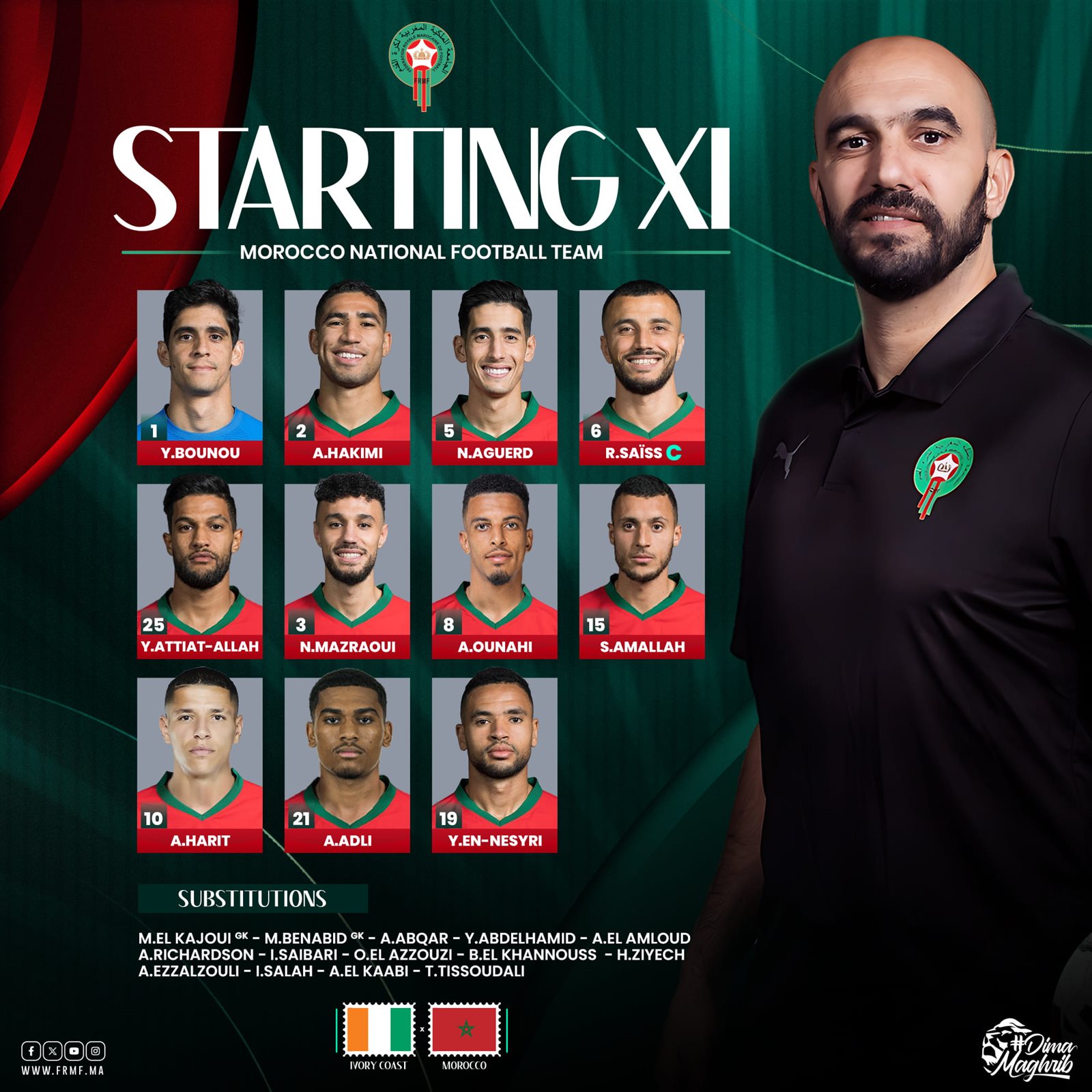 أعلن المغربي وليد الركراكي مدرب منتخب المغرب عن تشكيل فريقه استعدادا لخوض المباراة الودية أمام ساحل العاج، والتي ستقام في الثامنة مساء بتوقيت القاهرة في كوت ديفوار.