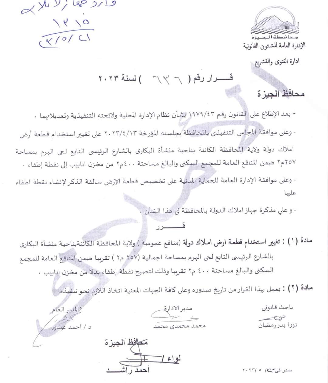 خصصت محافظة الجيزة تحت إشراف اللواء أحمد راشد قطعة أرض أملاك دولة بمنطقة منشاة البكاري لعمل نقطة مطافئ.