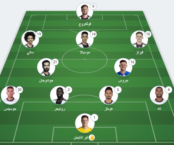 وأحرز نيكلاس هدف المانيا الثاني في الدقيقة 58 ثم عزز تقدم ألمانيا اللاعب جمال موسيالا بالهدف الثالث في الدقيقة 63 من المباراة.