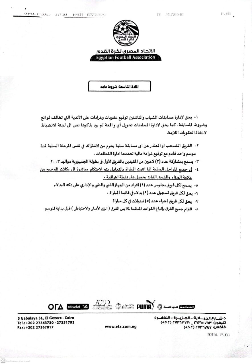 ويسمح بمشاركة ثلاث لاعبين من الفريق الأول بالنادي في بطولات الجمهورية مواليد 2003.
