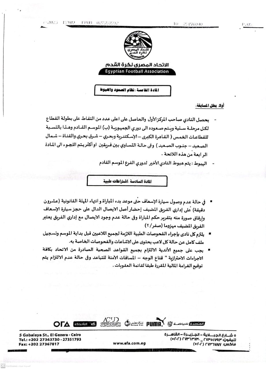 يصعد صاحب المركز الأول من دوري القطاعات إلى دوري الجمهورية ب في الموسم الجديد بالنسبة للقطاعات الخمسة ( القاهرة الكبري - الاسكندرية وبحري - شرق بحري والقناة - شمال الصعيد - جنوب الصعيد ).