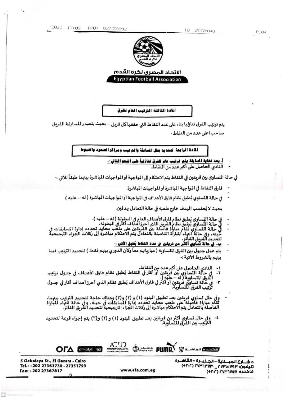 - في حالة تساوي فريقين في النقاط يتم الاحتكام إلى المواجهات المباشرة بينهما طبقا لفارق النقاط في المواجهة المباشرة، وفي حال التساوي يطبق نظام فارق الأهداف في المواجهة أو المواجهات المباشرة “له-عليه” بحيث لايحتسب الهدف خارج ملعبه في حال التعادل بهدفين، وفي حال التساوي يطبق نظام فارق الأهداف العام، وفي حال التساوي يطبق نظام الفريق الذي أحرز أهداف أكثر في البطولة، وفي حال التساوي تقام مباراة فاصلة علي ملعب محايد والاحتكام لركلات الترجيح حال انتهاء المباراة الفاصلة بالتعادل.