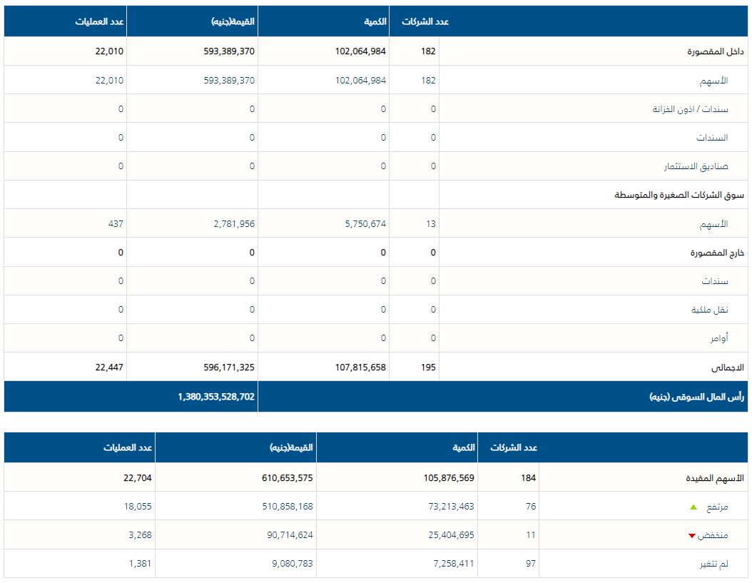 وتباينت مؤشرات البورصة بختام تعاملات الأربعاء الماضي، وسجل رأس المال السوقي نحو 1.325 تريليون جنيه، ونحو 2.9 مليار جنيه.