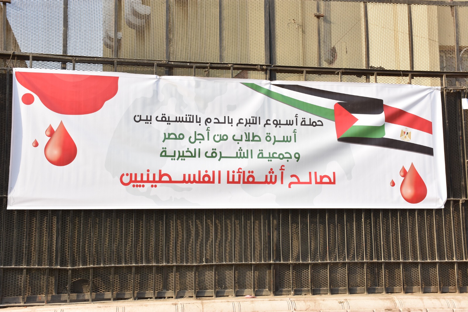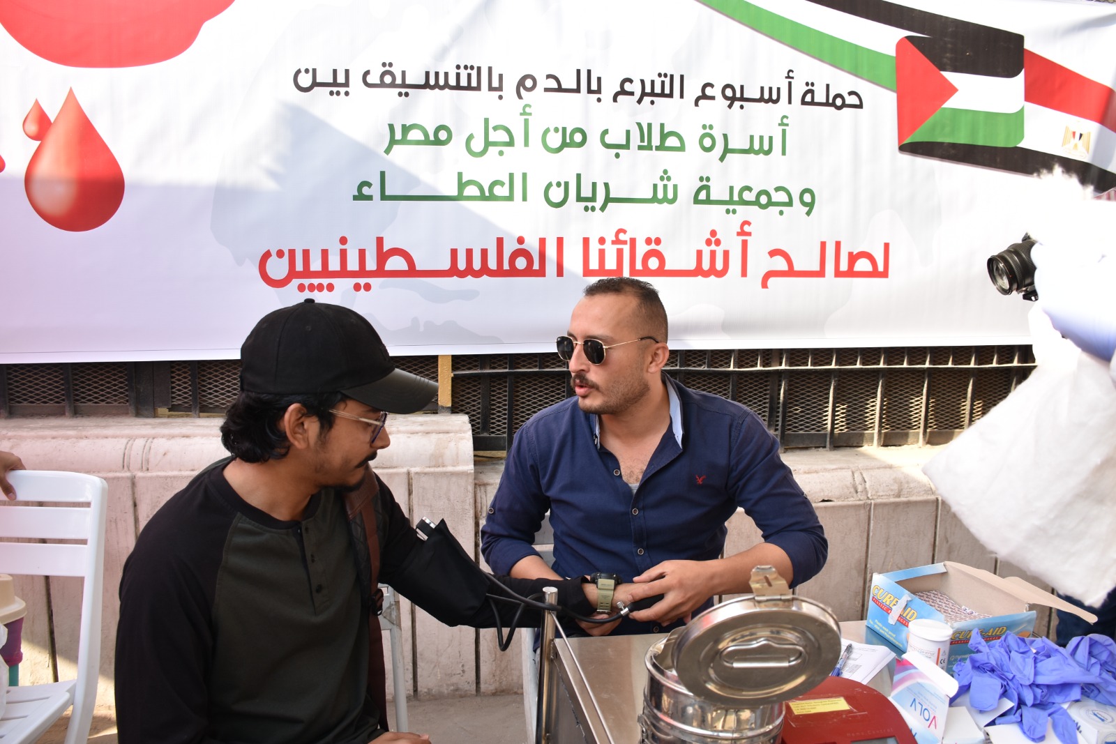 ونظمت جامعة عين شمس حملة للتبرع بالدم لصالح الأخوة الفلسطينيين بالتعاون مع "جمعية شريان العطاء بطب عين شمس للتبرع بالدم".