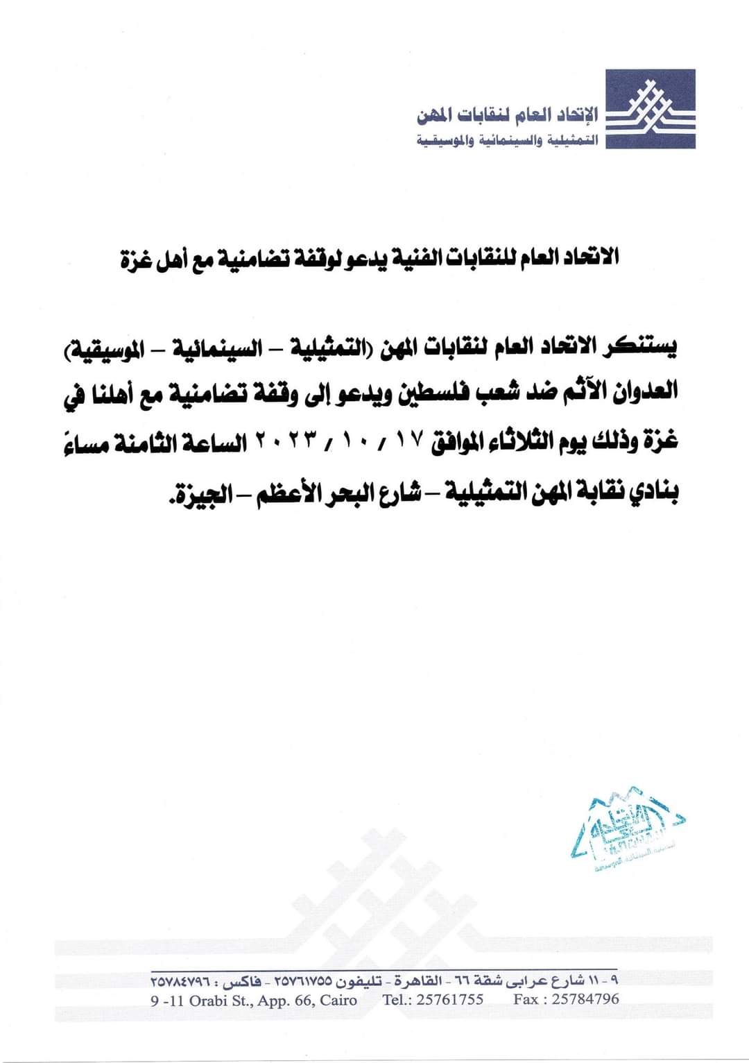 وجاء في بيان الاتحاد العام لنقابات المهن التمثيلية والسينمائية والموسيقية: "يستنكر الاتحاد العام لنقابات (التمثيلية- السينمائية- الموسيقية) العدوان الآثم ضد شعب فلسطين ويدعوا إلى وقفة تضامنية مع أهلنا في غزة، وذلك يوم الثلاثاء 17-10-2023، الساعة الثامنة مساءً بنادي نقابة المهن التمثيلية- شارع البحر الأعظم - الجيزة".