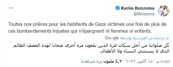 وفي نفس السياق، غرد النجم الفرنسي صاحب الأصول الجزائرية، كريم بنزيما، مهاجم اتحاد جدة السعودي، عبر حسابه على منصة إكس، مساء اليوم الأحد، لدعم فلسطين أمام العدوان الإسرائيلي.