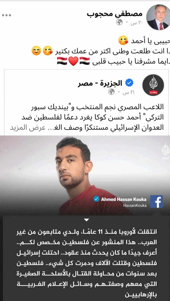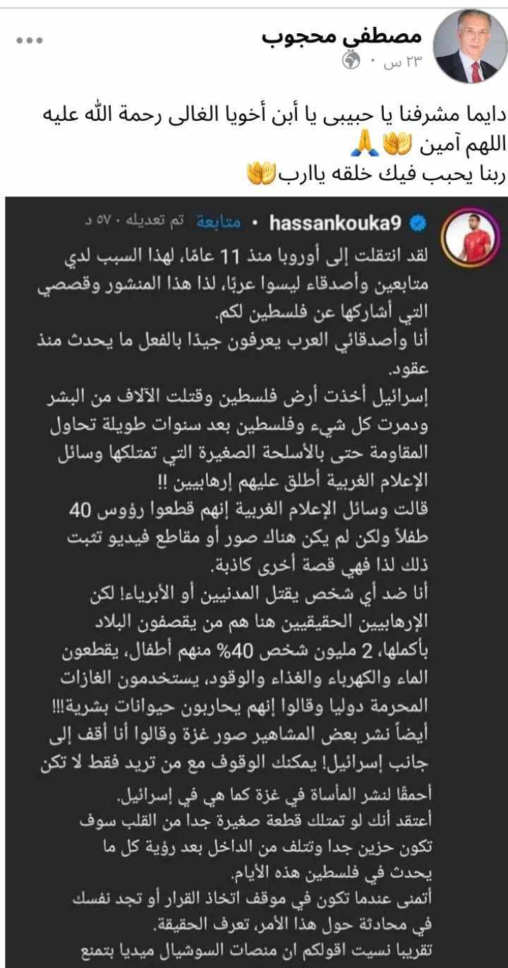 وقد وجه المصري أحمد حسن كوكا، مهاجم فريق بينديك التركي ومنتخب مصر، رسالة نارية إلى إسرائيل بسبب ما ترتكبه من جرائم ضد الشعب الفلسطيني.