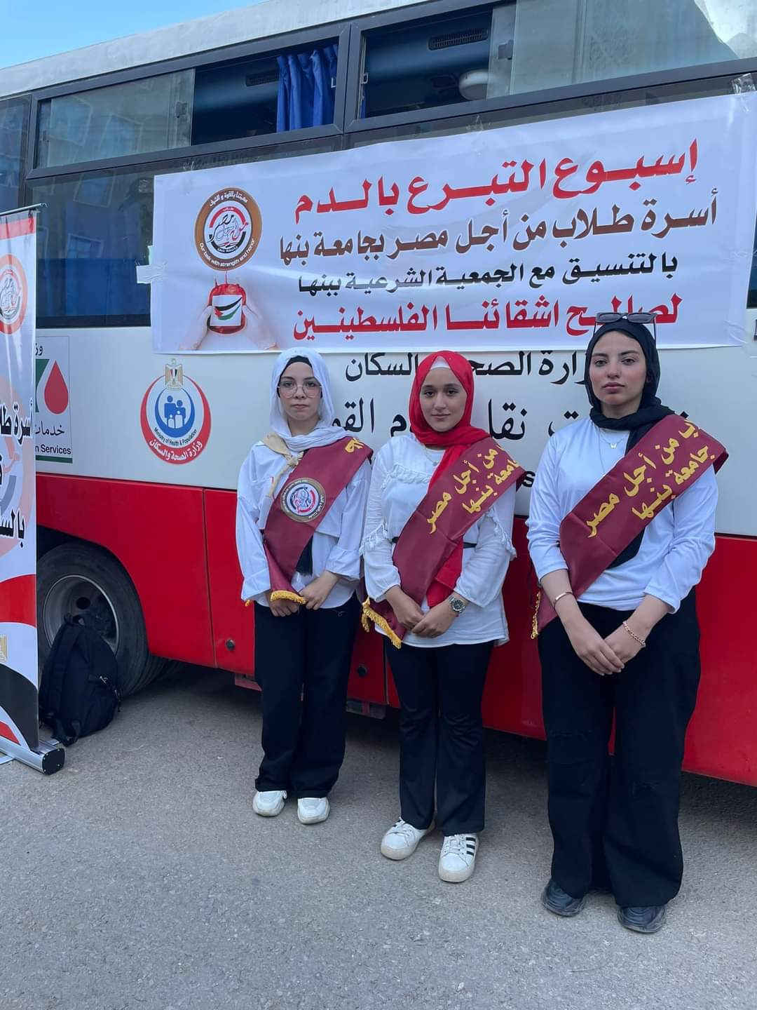 واصلت أسرة طلاب من أجل مصر بجامعة بنها، أسبوع التبرع بالدم لصالح الأشقاء الفلسطينيين، بكليات الجامعة، وذلك تحت رعاية الدكتور ناصر الجيزاوي رئيس جامعة بنها، والدكتور تامر سمير نائب رئيس الجامعة لشئون التعليم والطلاب، والدكتور خالد عيسوي منسق أسرة طلاب من أجل مصر، وذلك بكلية التجارة بالجامعة، حيث شهدت إقبالا كبيرا من الطلاب والأساتذة بالكلية والإداريين.