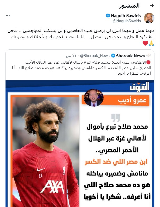 محمد صلاح، وجه رجل الأعمال، المهندس نجيب ساويرس، رسالة قوية للاعب المنتخب ونجم ليفربول محمد صلاح، وذلك بعد إعلان تبرعه لصالح أهالي غزة، دعمًا لأهل فلسطين عبر الهلال الأحمر المصري.