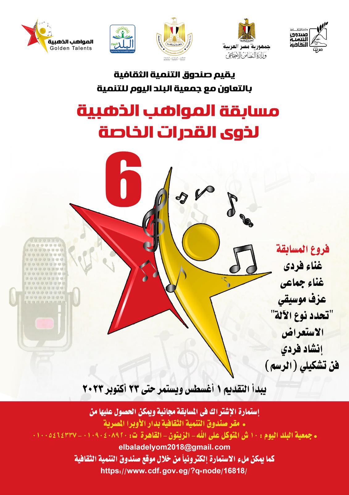 قررت اللجنة التنفيذية لمسابقة المواهب الذهبية لذوي الهمم في نسختها السادسة، والتي ينظمها قطاع صندوق التنمية الثقافية، مد فترة استقبال الأعمال المشاركة بالمسابقة حتى ٢٣ أكتوبر الجاري، وذلك بعد مشاركة وزارة التربية والتعليم وبداية العام الدراسى الجديد، لإتاحة الفرصة لأكبر عدد من أبنائنا من أصحاب الهمم من جميع محافظات مصر للمشاركة.