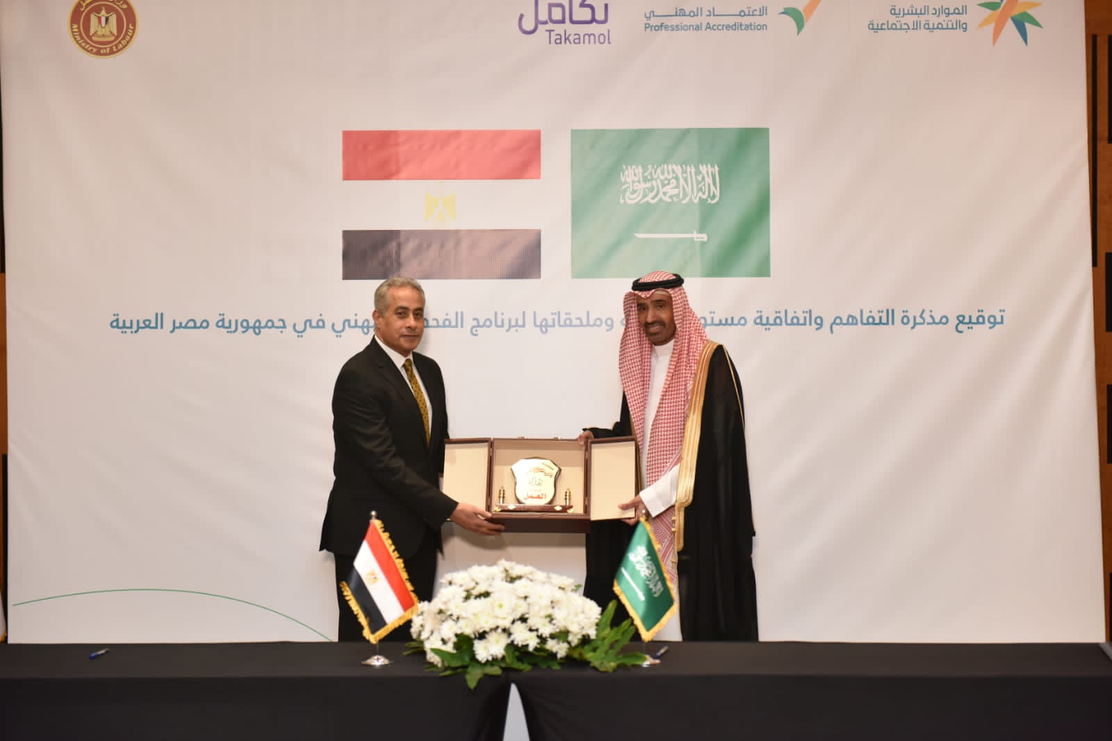 واشار الى انه تنفيذًا لأوجه التعاون العُمالي المتفق عليها بينهما،فقد تلاقت إرادة الطرفان على إنشاء برنامج الفحص المهني للتعاون في تحقيق الأهداف المشتركة في هذا المجال،حيث وَقّع على مذكرة التفاهم:المهندس أحمد بن محمد الحديثي وكيل وزارة الموارد البشرية والتنمية الاجتماعية للتأهيل والتوجيه الاجتماعي السعودي المُكلّف،ود.رشا عبد الباسط عبد العزيز رئيس الإدارة المركزية للعلاقات الدولية ومُتابعة شؤون المواطنين المصريين بالخارج بوزارة عمل مصر..وعلى إتفاقية الفحص المهني:أيمن قطامش رئيس الإدارة المركزية للتدريب المهني بوزارة عمل مصر،والسيد فوزان عبدالله المهيدب نائب الرئيس التنفيذي لشركة تكامل لخدمات الأعمال،وهي "شركة سعودية مملوكة لجهات حكومية تعمل تحت مظلة وزارة الموارد البشرية والتنمية الإجتماعية في المملكة السعودية "..