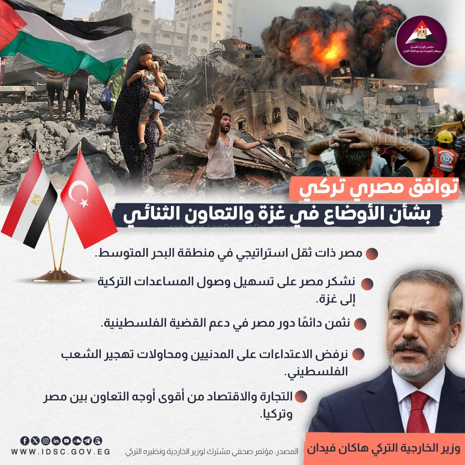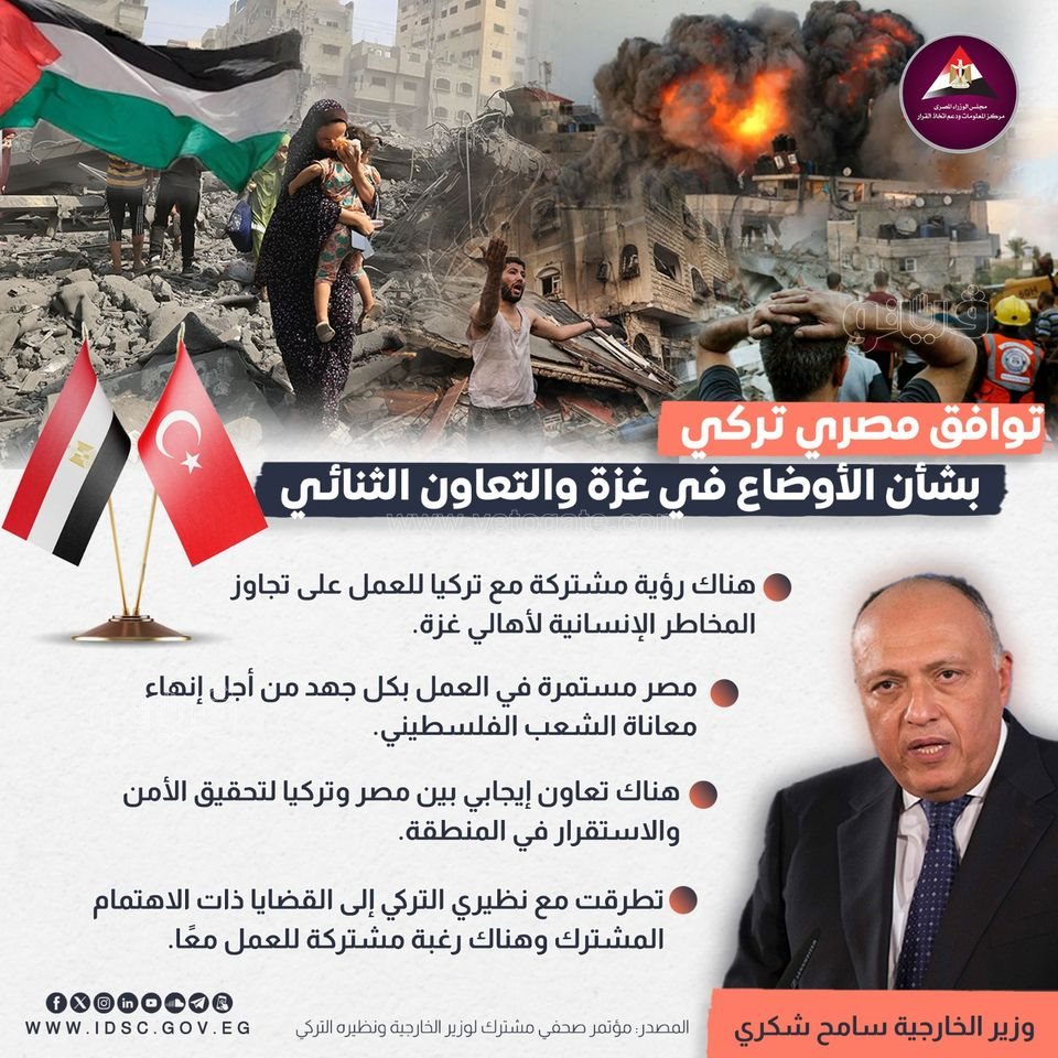 طوفان الأقصي، نشرت الصفحة الرسمية لمركز المعلومات ودعم اتخاذ القرار بمجلس الوزراء على موقع التواصل الاجتماعي فيسبوك انفوجراف جديد تحت عنوان (توافق مصري تركي بشأن الأوضاع في غزة والتعاون الثنائي)