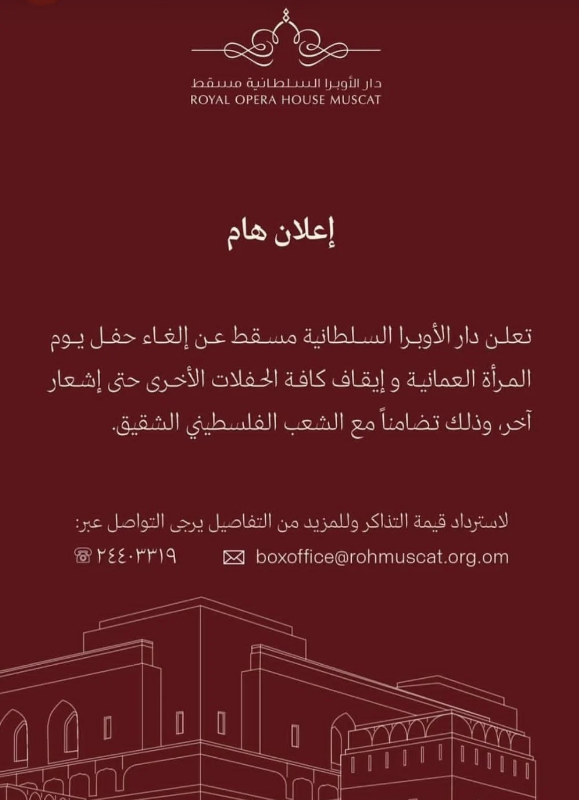 وجاء بيان دار الأوبرا السلطانية بمسقط، كالتالي: "تعلن دار الأوبرا السلطانية مسقط، عن إلغاء حفل يوم المرأة العمانية، وإيقاف كافة الحفلات الأخرى، حتى إشعار آخر.. وذلك تضامنًا مع الشعب الفلسطيني الشقيق".