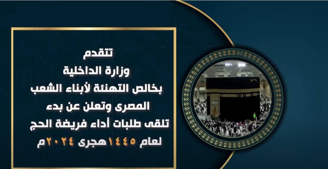وتقدمت وزارة الداخلية بخالص التهنئة لأبناء الشعب المصري العظيم بمناسبة الإعلان عن بدء قبول طلبات التقدم لأداء فريضة الحج لعام 1445 هـ /2024 م.. اعتبارًا من يوم السبت الموافق 21/10/2023 م حتى يوم الإثنين الموافق 6/11/2023 م.. بجميع مراكز وأقسام الشرطة بكافة مديريات الأمن أو من خلال الموقع الإلكتروني للإدارة العامة للشئون الإدارية على بوابة وزارة الداخلية عبر شبكة الإنترنت، أو من خلال الاتصال بالخدمة الصوتية المخصصة لذلك.