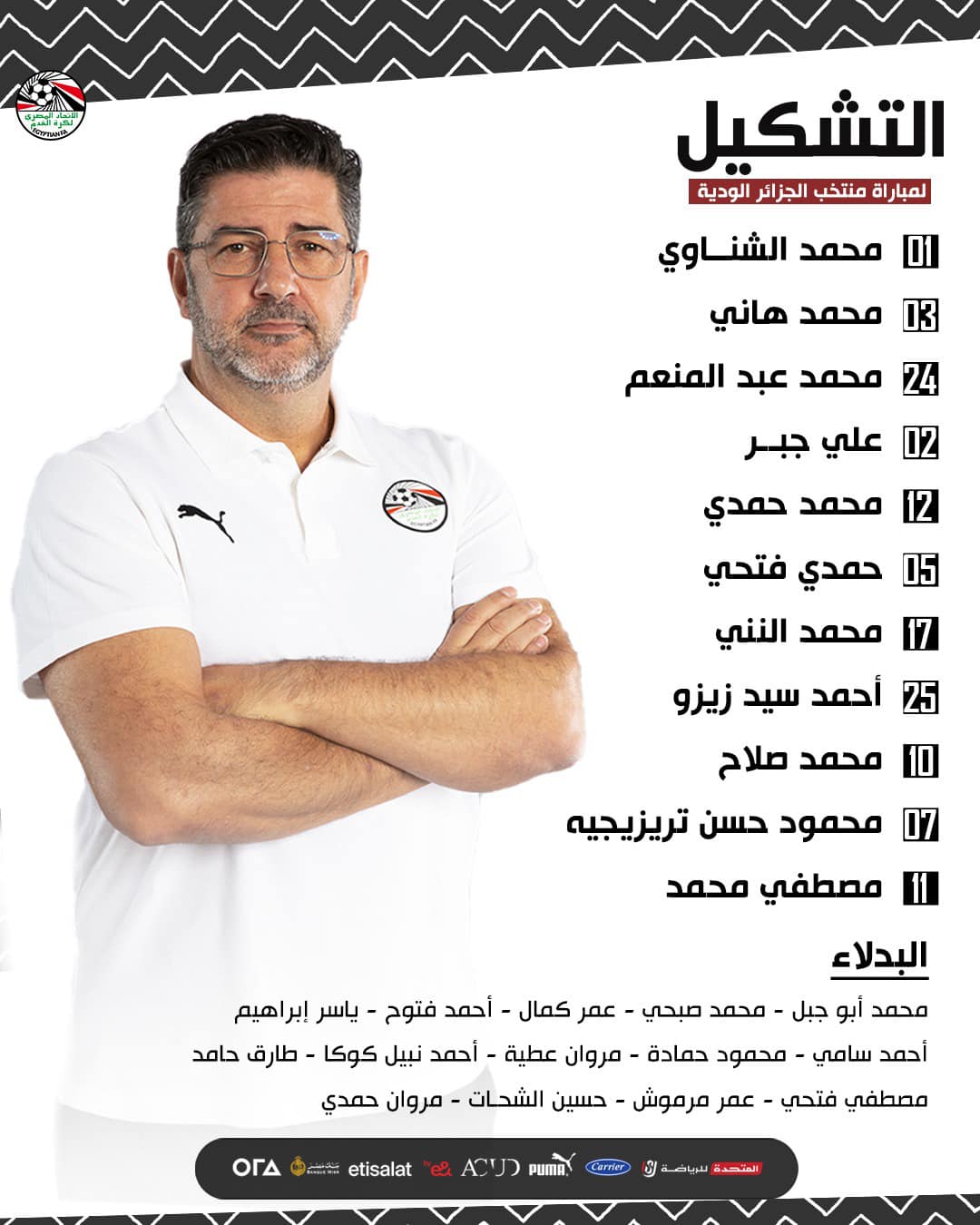 منتخب مصر، أعلن الجهاز الفني لمنتخب مصر الأول لكرة القدم، بقيادة البرتغالي روي فيتوريا، عن التشكيل الذي سيخوض به مباراته أمام منتخب الجزائر في اللقاء الودي المقرر له السابعة مساء اليوم بإستاد هزاع بن زايد بالإمارات وجاء كالتالي: