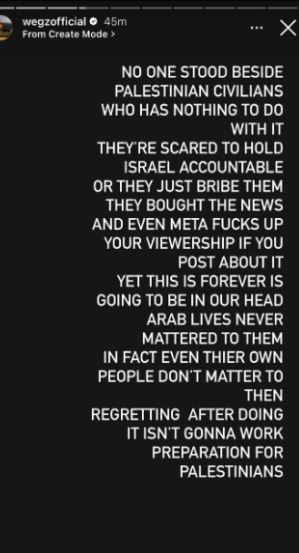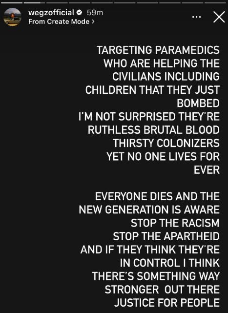 في هذا السياق، نشر ويجز عبر خاصية القصص بحسابه الرسمي بـ إنستجرام تضامنًا مع أهالي فلسطين، باللغة الإنجليزية، قائلًا: استهداف المسعفين الطبيين الذين يساعدون المدنيين، بما في ذلك الأطفال الذين قاموا بقصفهم.. أنا لست مندهشًا من كونهم مستعمرين وحشيين متعطشين للدماء، ومع ذلك لا أحد يعيش إلى الأبد، الجميع يموت والجيل الجديد مدرك للسيطرة، وأعتقد أن هناك شيئًا قويًا هناك العدالة للناس، أوقفوا العنصرية، أوقفوا الفصل العنصري.
