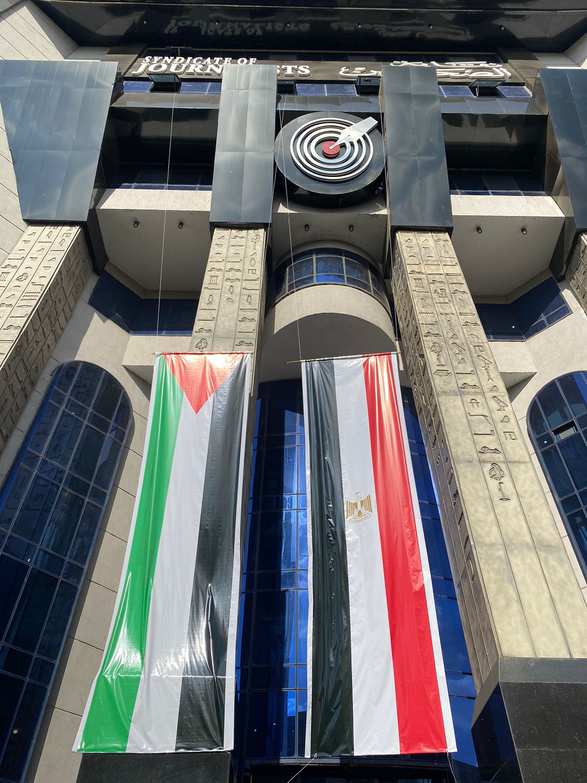 تزينت نقابتا الصحفيين والمحامين، بالعلم الفلسطيني إلى جانب العلم المصري، في رمزية لدعم وتضامن الصحفيين والمحامين مع حقوق الشعب الفلسطيني، وتنديدًا بجرائم الاحتلال التي تُرتكب في حقه.
