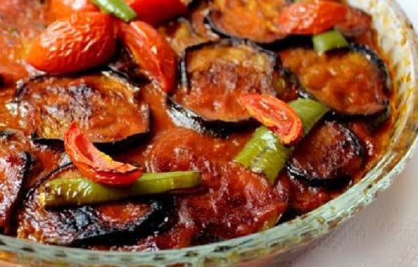 - ثم نحضر صينية الفرن ونرص بها طبقة باذنجان وطبقة بطاطس وطبقة لحم ثم نكرر الطبقات حتى انتهى الكمية ونرص حلقات الفلفل والطماطم على الوجه، ونرش عصير الطماطم والصلصة والتوابل على الوجه.