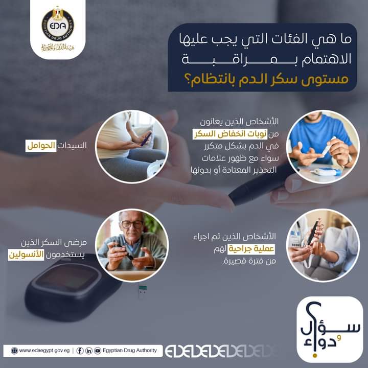 وكشفت هيئة الدواء المصرية عن وجود عدد من الفئات التي يجب عليها الإهتمام بمراقبة مستوى سكر الدم بانتظام منهم: