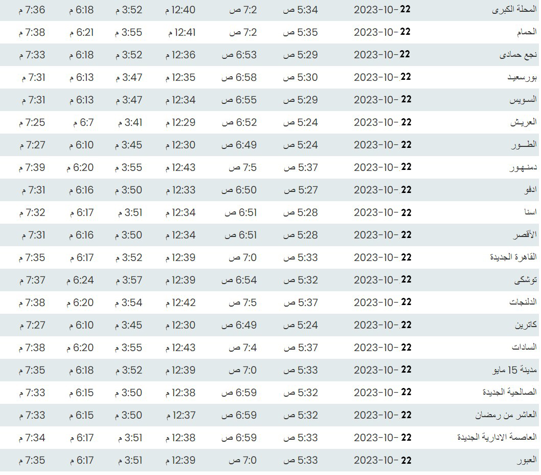 مواقيت الصلاة اليوم وفقًا للتوقيت المحلي لمدينتي القاهرة والإسكندرية وكذلك، مواقيت الصلاة، لعدد من مدن ومحافظات الجمهورية من واقع بيانات الهيئة العامة للمساحة
