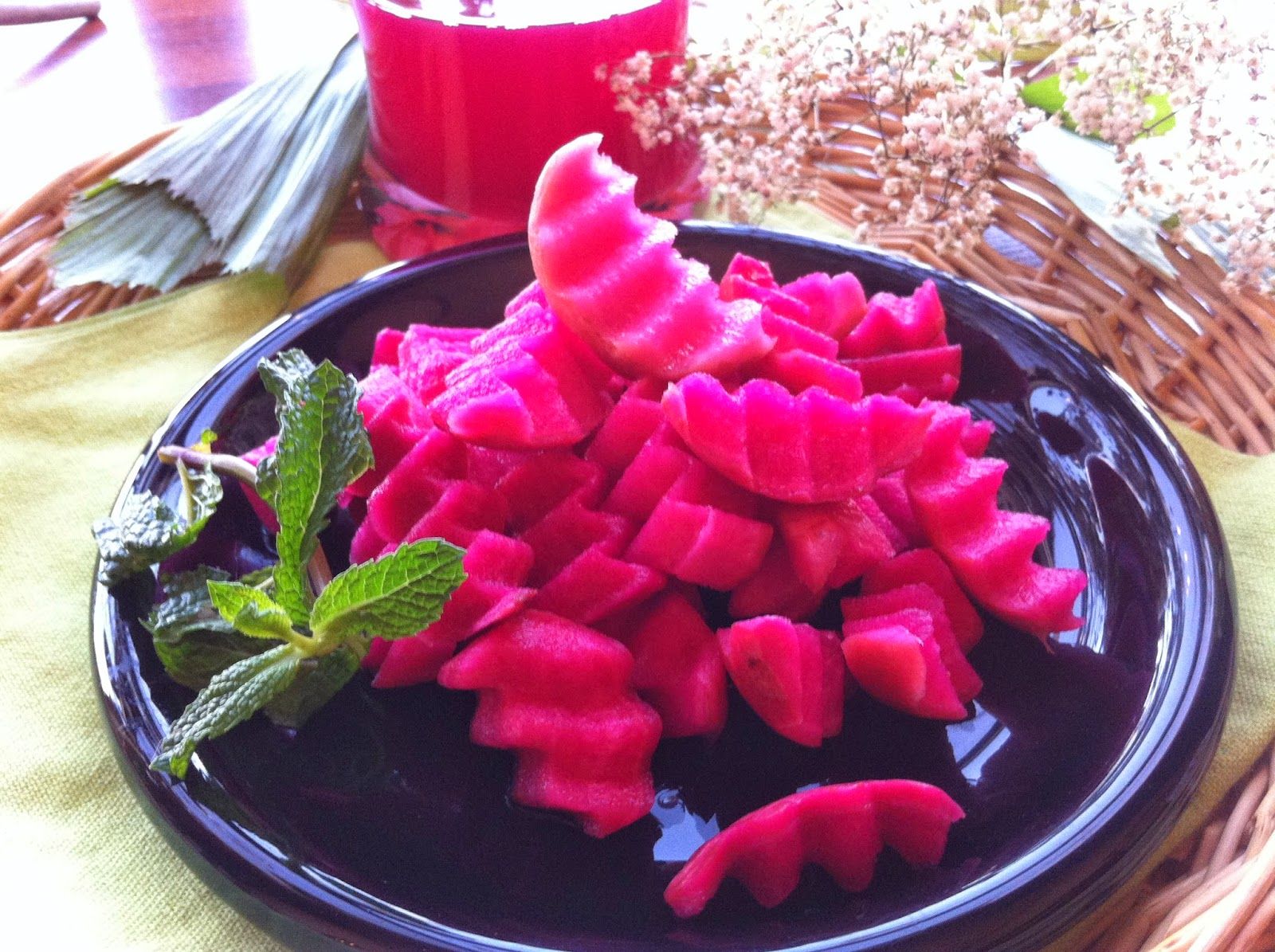 نضع البنجر في الكبة – وهذه أفضل طريقة لعمل البنجر لتوحيد لون ماء اللفت ولون اللفت – ونضيف الفلفل الحار.