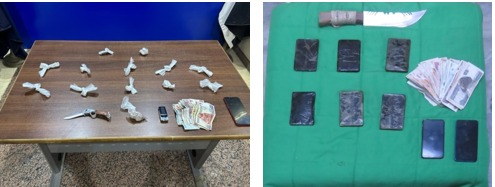كما تم ضبط (مبالغ مالية–فرد خرطوش–طلقات نارية-5 سيارات–3 دراجات نارية – 13 سلاح أبيض – 5 ميزان –6000 قرص وأمبول لأدوية مهربة وغير مصرح بتداولها).
