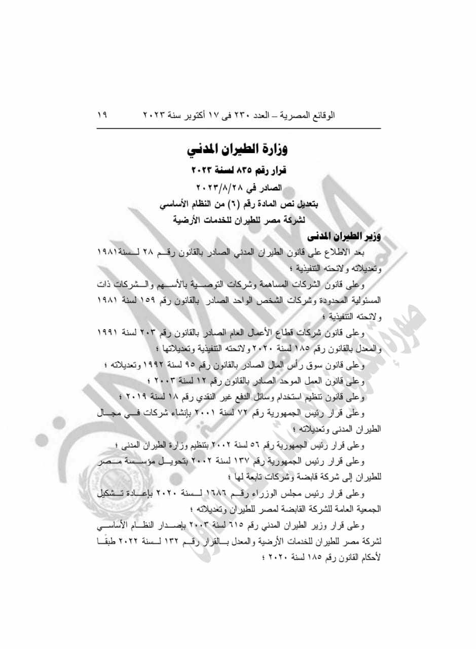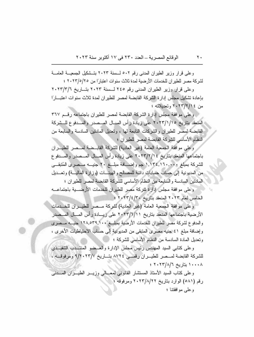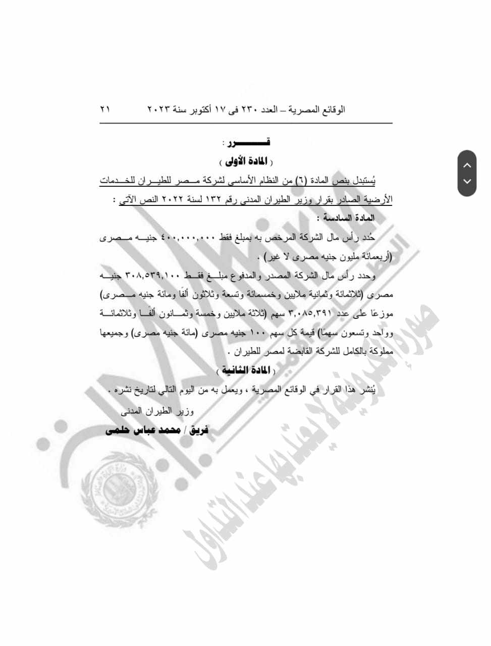 نشرت الجريدة الرسمية قرار الفريق محمد عباس حلمي وزير الطيران المدني، رقم 132 لسنة 2023، حول النظام الأساسي لشركة مصر للطيران للخدمات الأرضية التابعة للقابضة مصر للطيران.