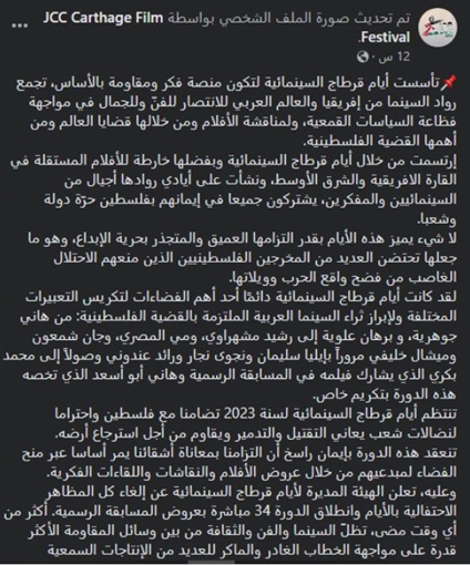 واستكمل "تنتظم أيام قرطاج السينمائية لسنة 2023 تضامنا مع فلسطين واحتراما لنضالات شعب يعاني التقتيل والتدمير ويُقاوم من أجل استرجاع أرضه، تنعقد هذه الدورة بإيمان راسخ أن التزامنا بمعاناة أشقائنا يمر أساسا عبر منح الفضاء لمبدعيهم من خلال عروض الأفلام والنقاشات واللقاءات الفكرية.