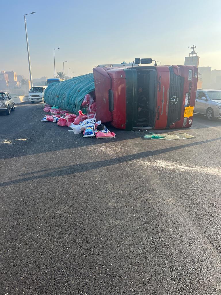 انقلاب سيارة نقل ثقيل محملة فول أعلى الطريق الدائري يتسبب في زحام مروري