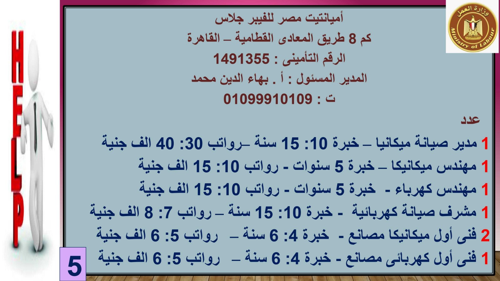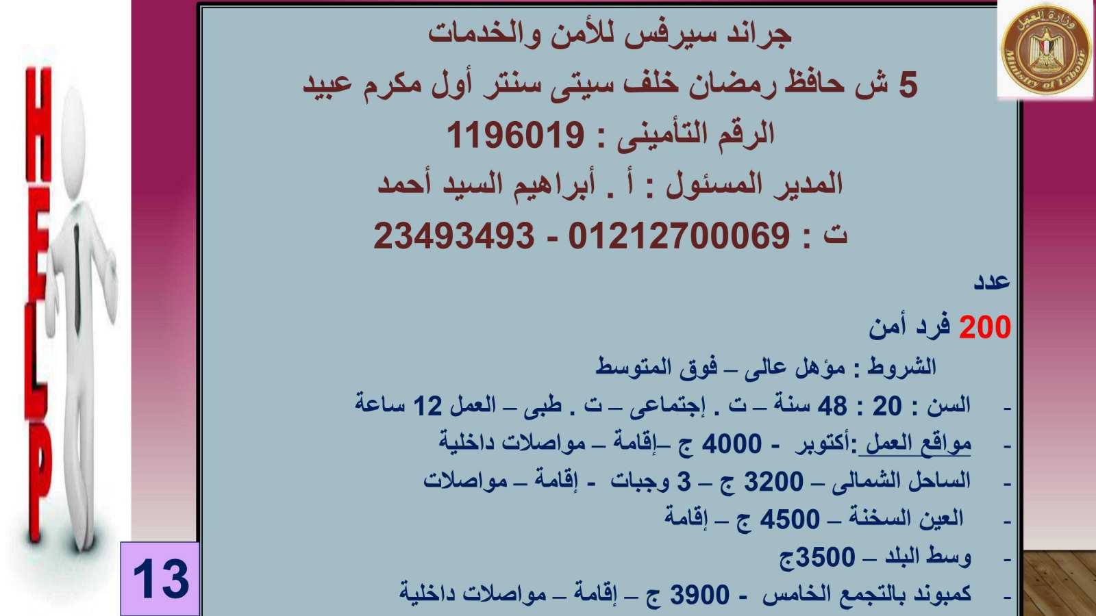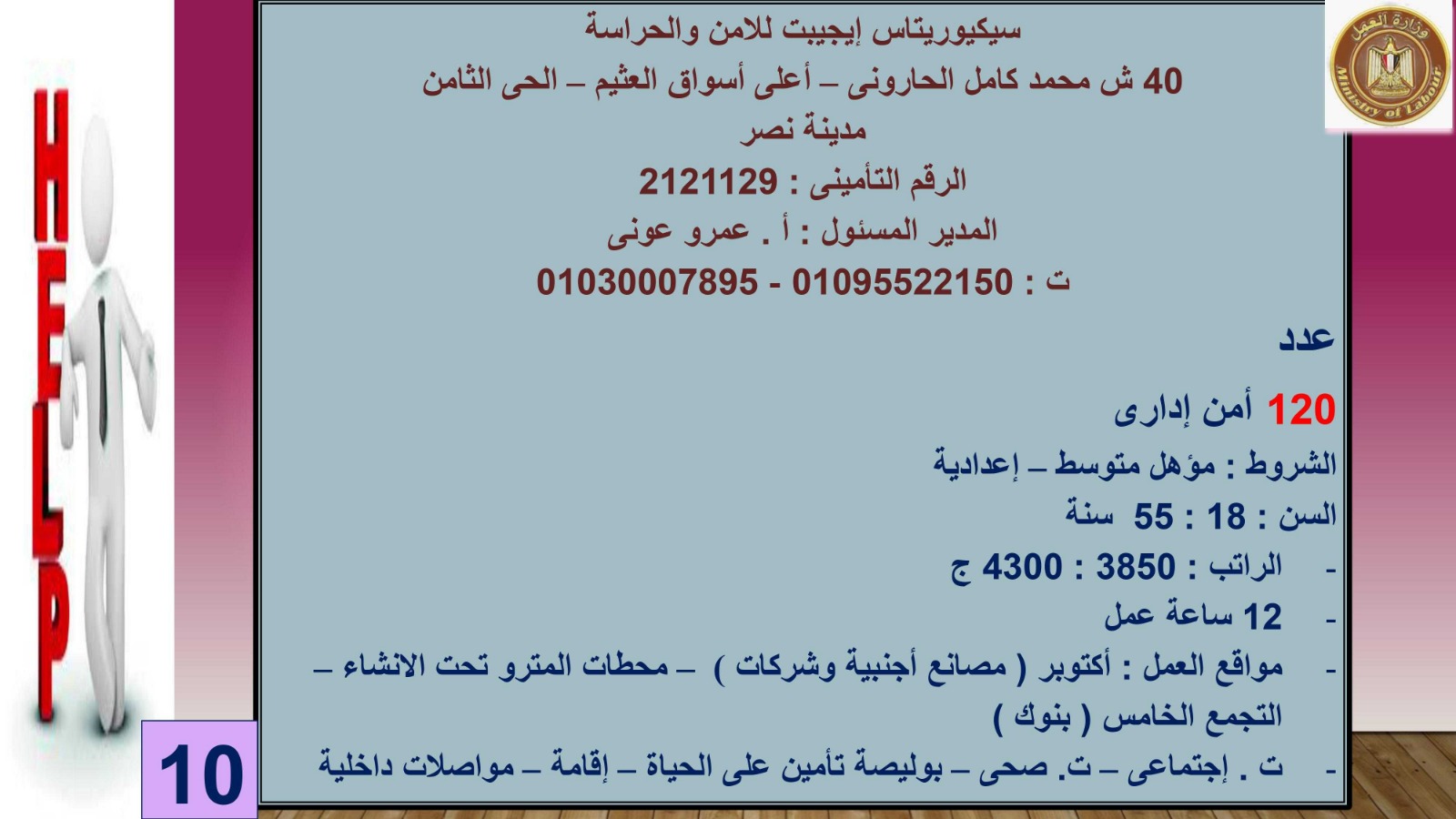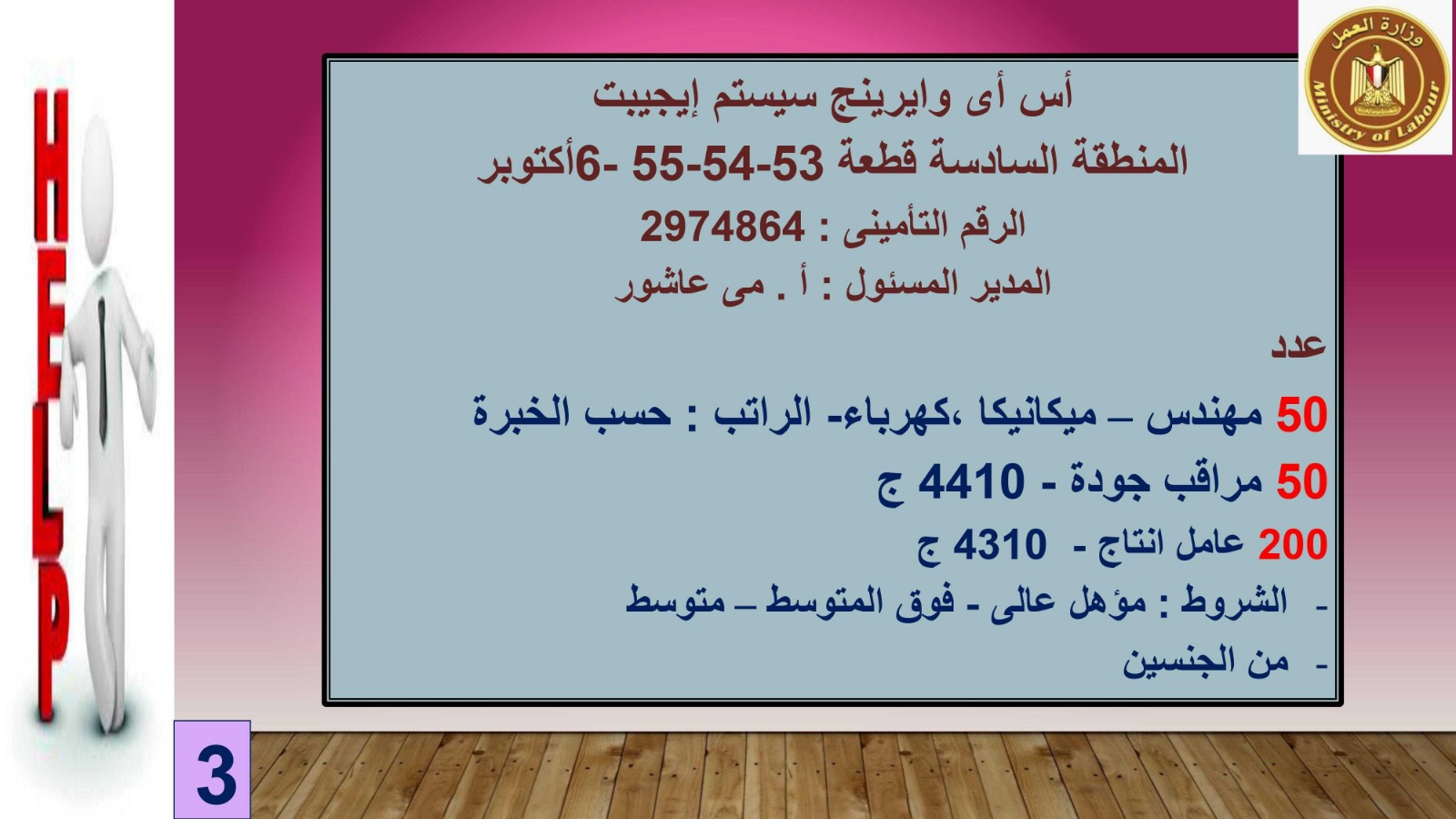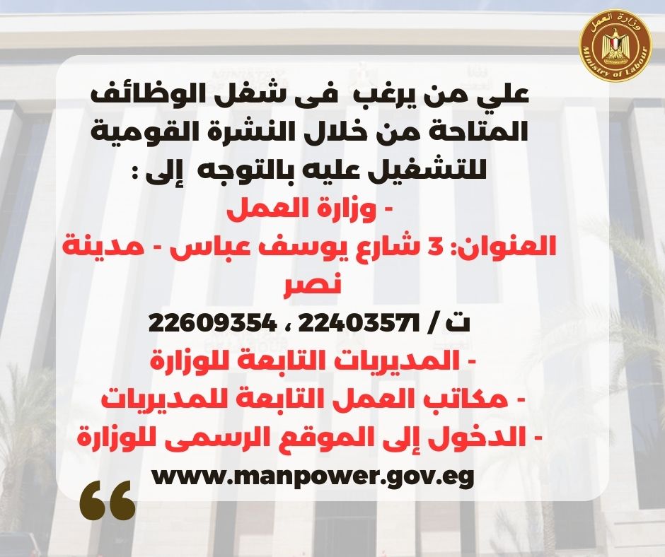 وجاء في البيان الصحفي،أن نشرة التوظيف الدورية تصدر عن "الوزارة" كل 15 يوم، من خلال الإدارة العامة للتشغيل برئاسة هبه أحمد مدير عام التشغيل بالوزارة، وإعداد منى شوقي باحث أول بالإدارة، تُعلن اليوم عن فرص عمل جديدة،متوفرة في 12 محافظة،هي:القاهرة، والجيزة، والشرقية،وبورسعيد، والقليوبية، والدقهلية،وأسيوط،وأسوان، وقنا،وسوهاج، والغربية، ودمياط...