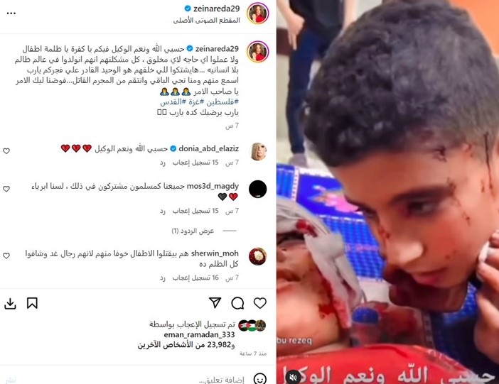 في هذا السياق، نشرت زينة، عبر حسابها على موقع الصور الشهير “انستجرام”، منشورا كتبت فيه "حسبي الله ونعم الوكيل فيكم يا كفرة يا ظلمة اطفال ولا عملوا اي حاجه لاي مخلوق، كل مشكلتهم انهم انولدوا في عالم ظالم بلا انسانيه …هايشتكوا للي خلقهم هو الوحيد القادر على فجركم يارب اسمع منهم ومنا نجي الباقي وانتقم من المجرم القاتل…فوضنا ليك الامر يا صاحب الامر يارب يرضيك كده يارب".