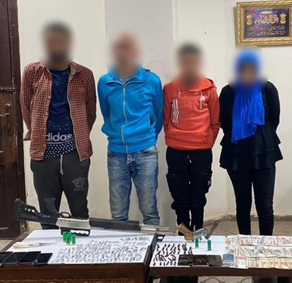 ضبط (6 عاطلين "لهم معلومات جنائية").. وبحوزتهم (كمية لمخدر الحشيش وزنت 15 كيلو جرام – كمية من مخدر البانجو وزنت 71 كيلو جرام- كمية من مخدر الهيروين وزنت كيلو جرام- 2 بندقية خرطوش- بندقية آلية- 2 فرد محلى وعدد من الطلقات مختلفة الأعيرة).