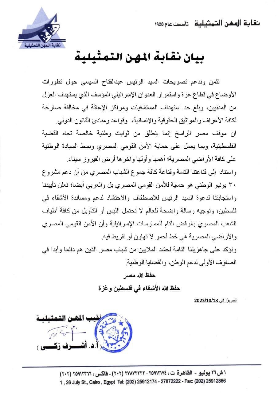 واختتم بيان نقابة المهن التمثيلية: “نؤكد على جاهزيتنا التامة لحشد الملايين من شباب مصر الذين هم دائما وأبدا في الصفوف الأولى لدعم الوطن، والقضايا الوطنية.. حفظ الله مصر.. حفظ الله الأشقاء في فلسطين وغزة”.