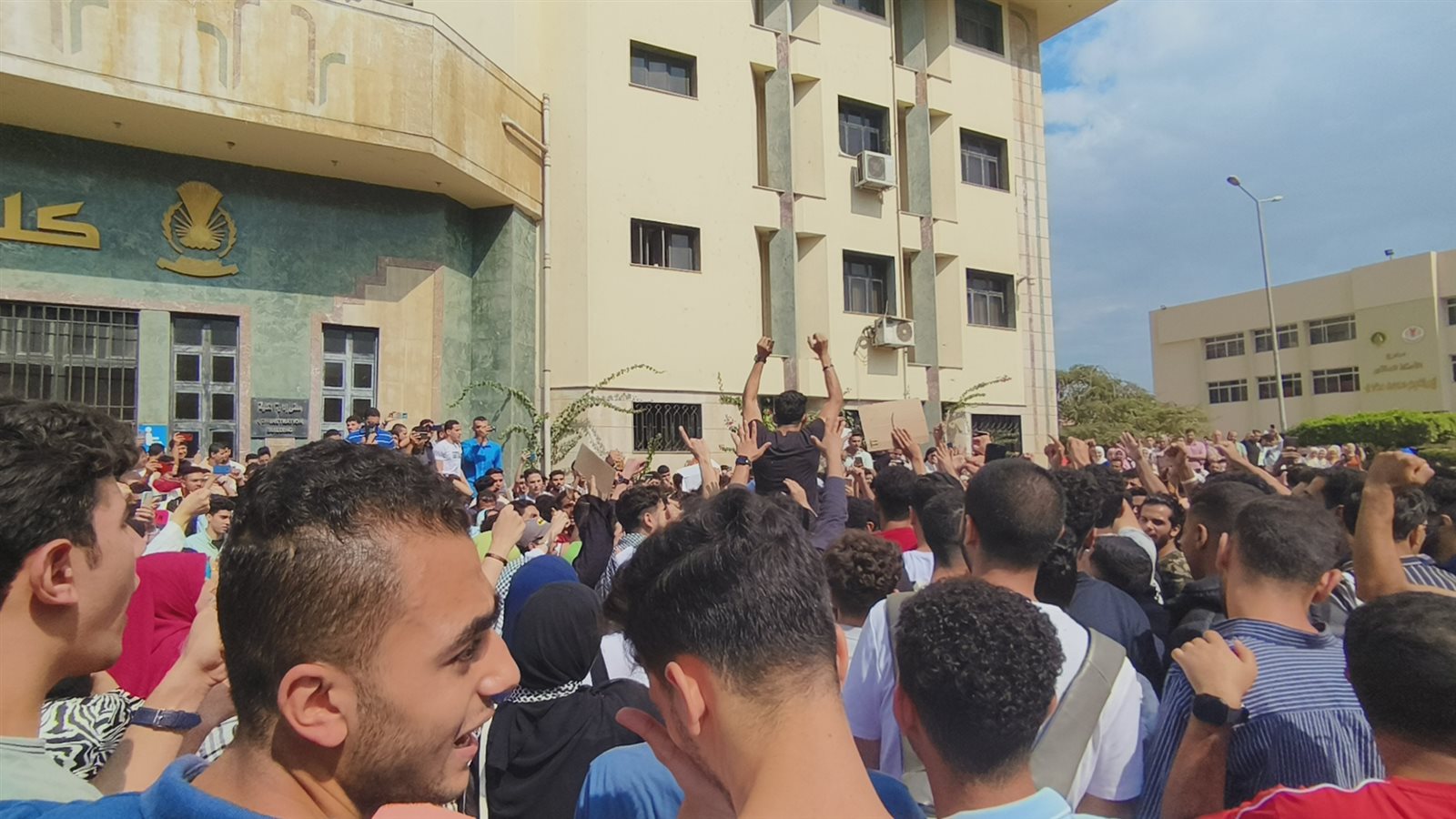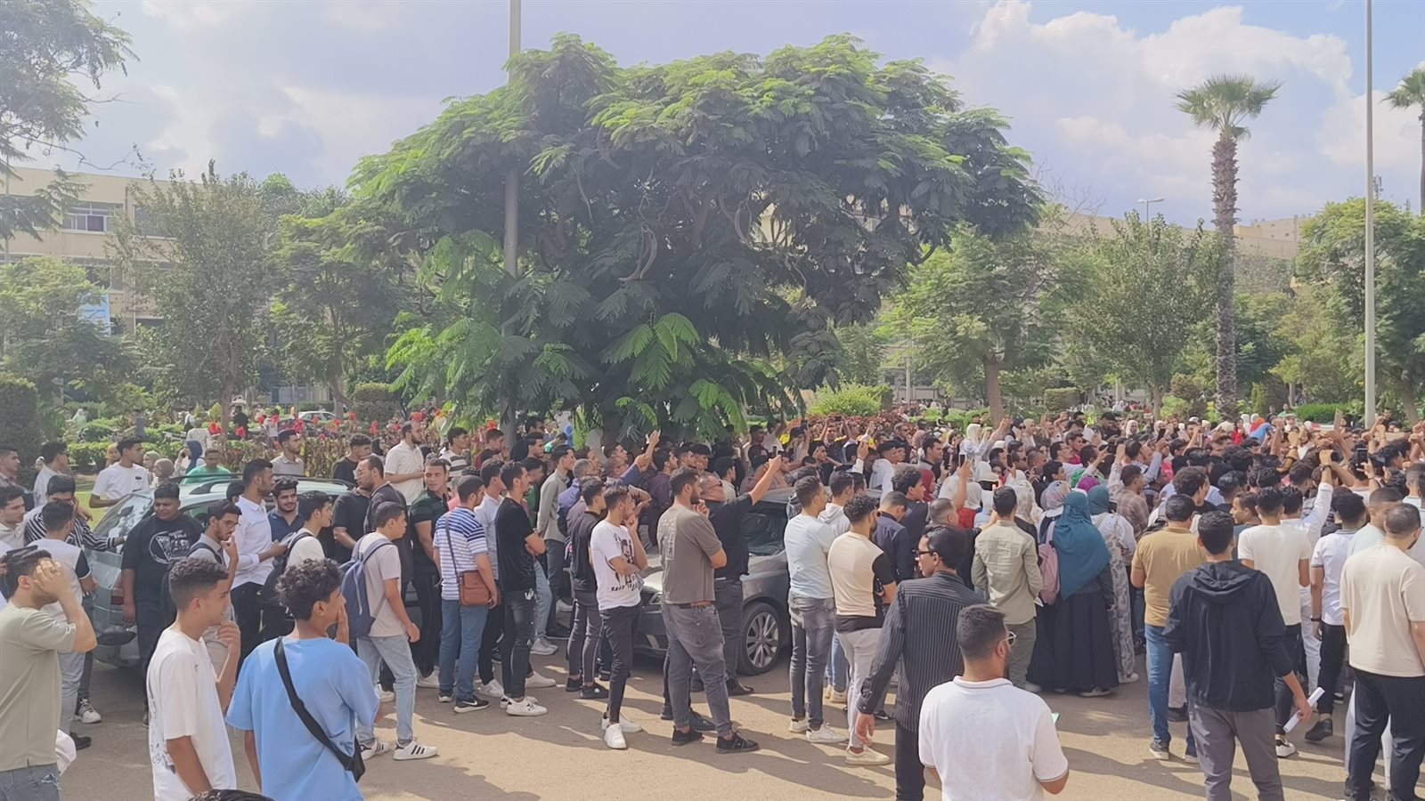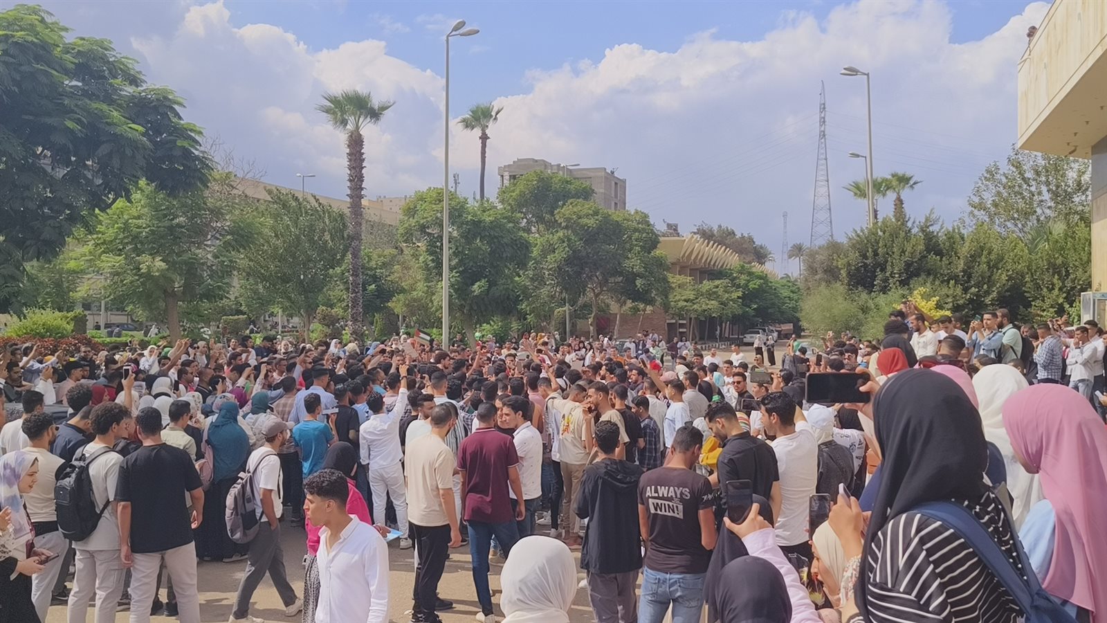 وتجمع العشرات من طلاب الجامعة مرددين هتافات تضامنية مع الشعب الفلسطيني منها “التكبير الله اكبر..الله اكبر، خيبر خيبر يا يهود جيش محمد سوف يعود، غزة هتفضل عربية، لبيك يا أقصى...بالروح بالدم نفديكي يا فلسطين..خيبر خيبر يا يا هود جيش محمد سوف يعود ، يا قسام يا حديد قصف دمر تل أبيب”.