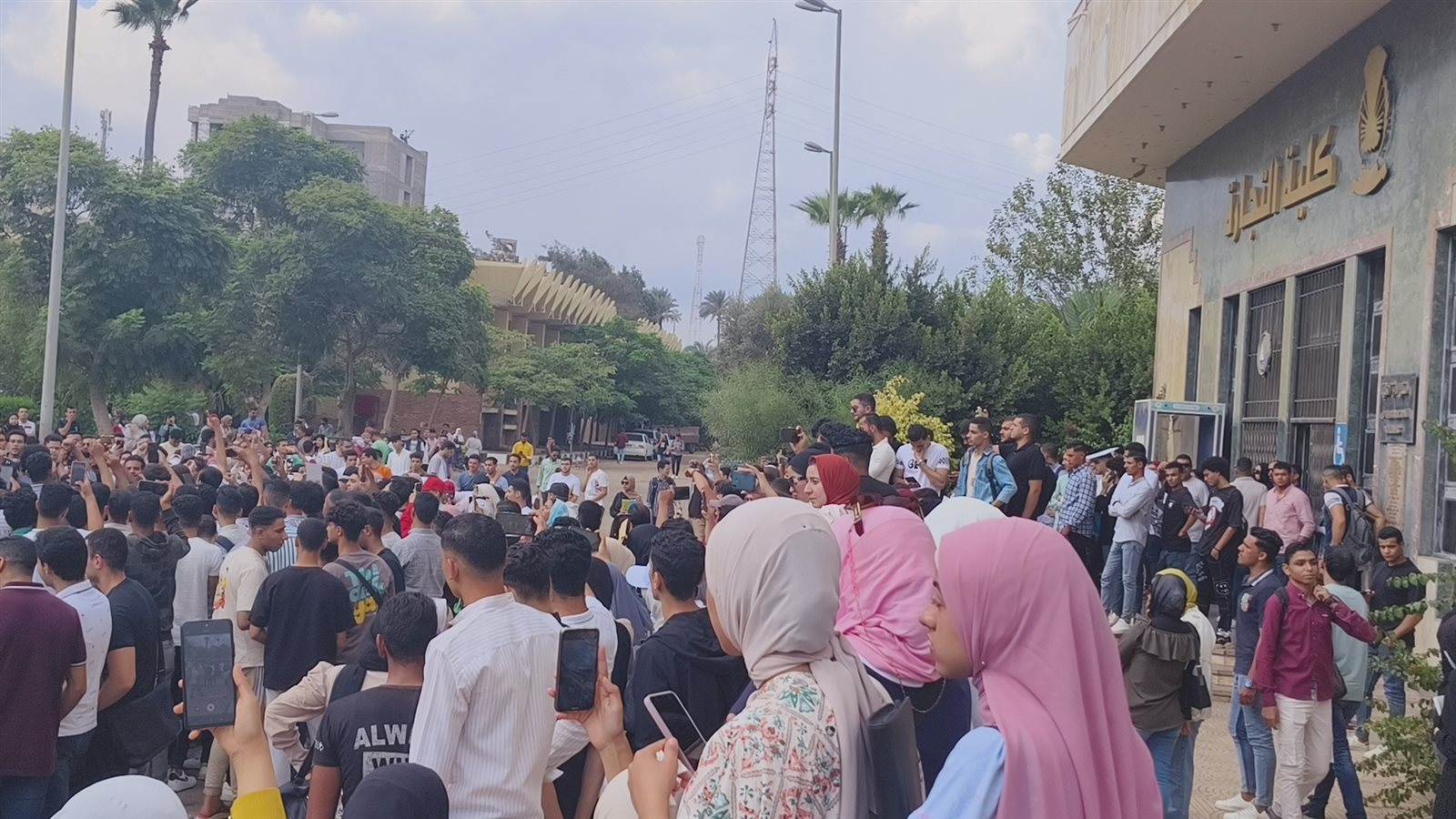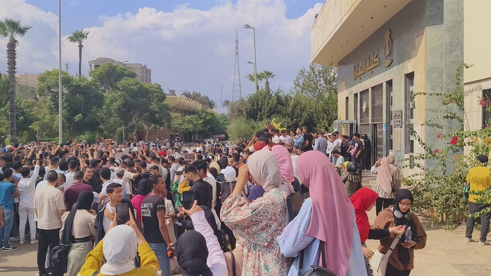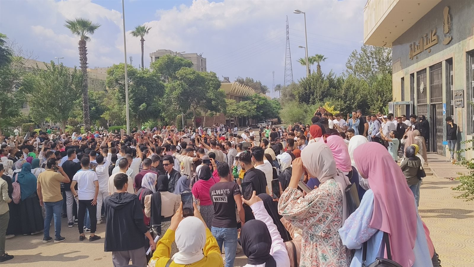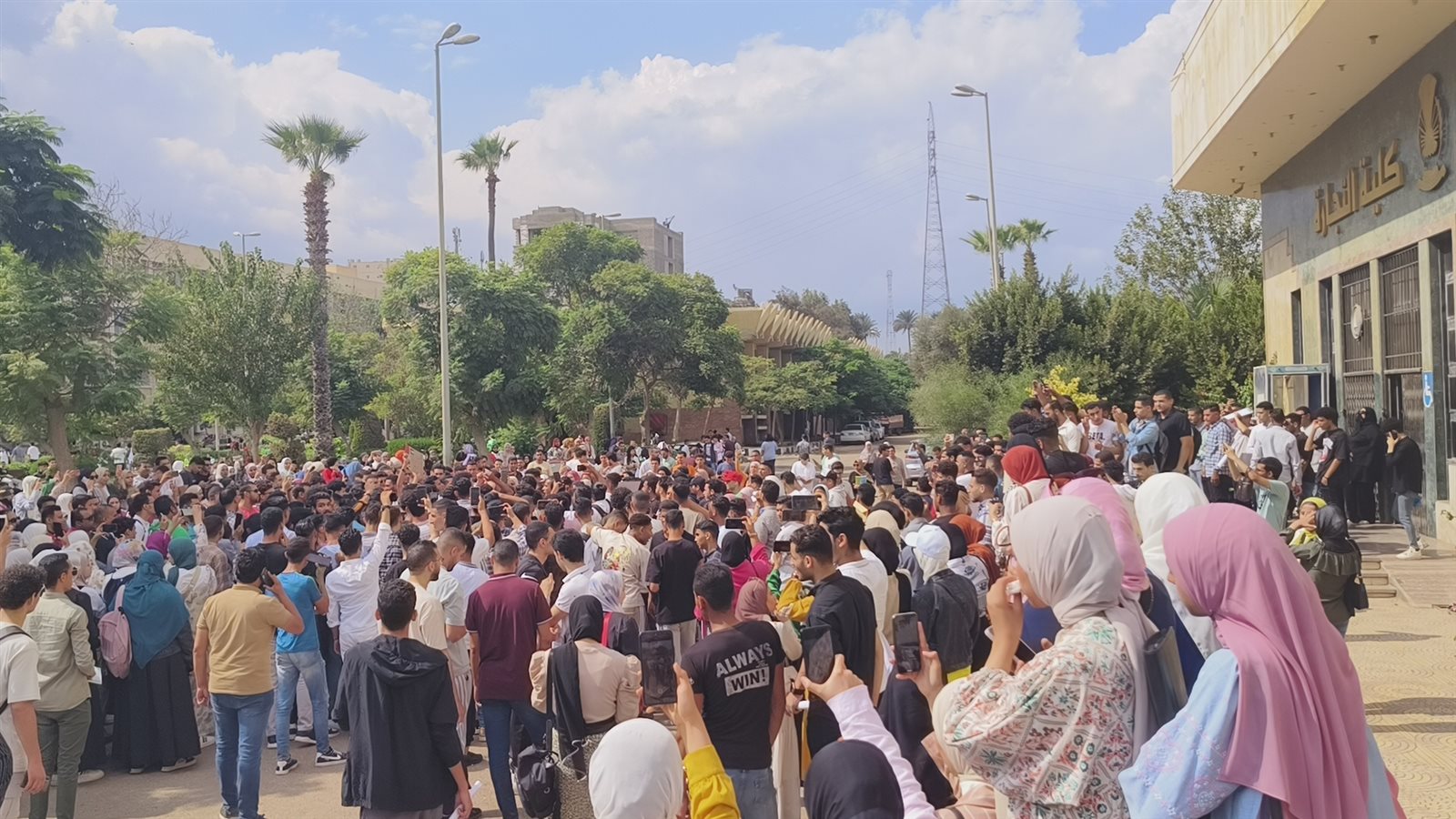 وتجمع العشرات من طلاب الجامعة مرددين هتافات تضامنية مع الشعب الفلسطيني منها “التكبير الله اكبر..الله اكبر، خيبر خيبر يا يهود جيش محمد سوف يعود، غزة هتفضل عربية، لبيك يا أقصى...بالروح بالدم نفديكي يا فلسطين..خيبر خيبر يا يا هود جيش محمد سوف يعود ، يا قسام يا حديد قصف دمر تل أبيب”.