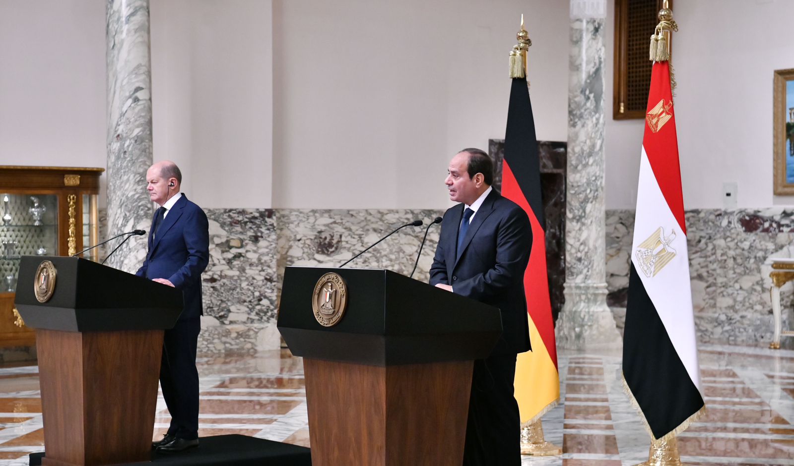 وألقى الرئيس كلمة خلال مؤتمر صحفي مشترك مع المستشار الألمانى أولاف شولتز بمقر رئاسة الجمهورية قصر الاتحادية اليوم وجاءت كلمة الرئيس السيسي: