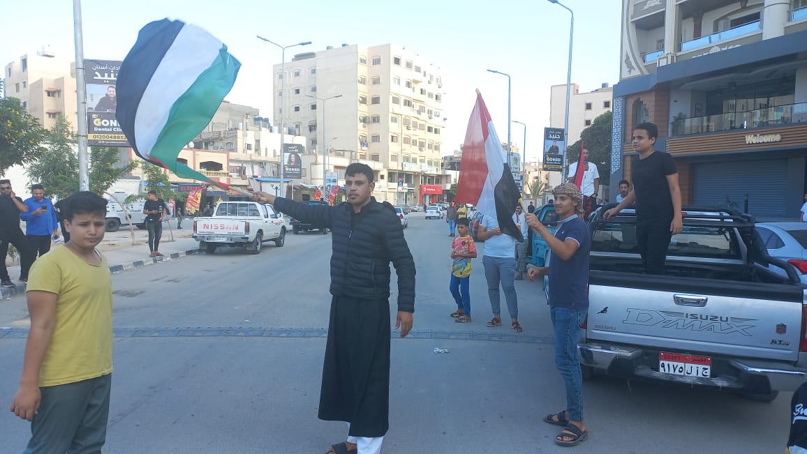 ورفع المواطنون بالعريش أعلام مصر وفلسطين، معلنين تضامنهم مع الشعب الفلسطيني الشقيق في الحرب الدائرة عليهم الآن واستشهاد الآلاف من الشعب.