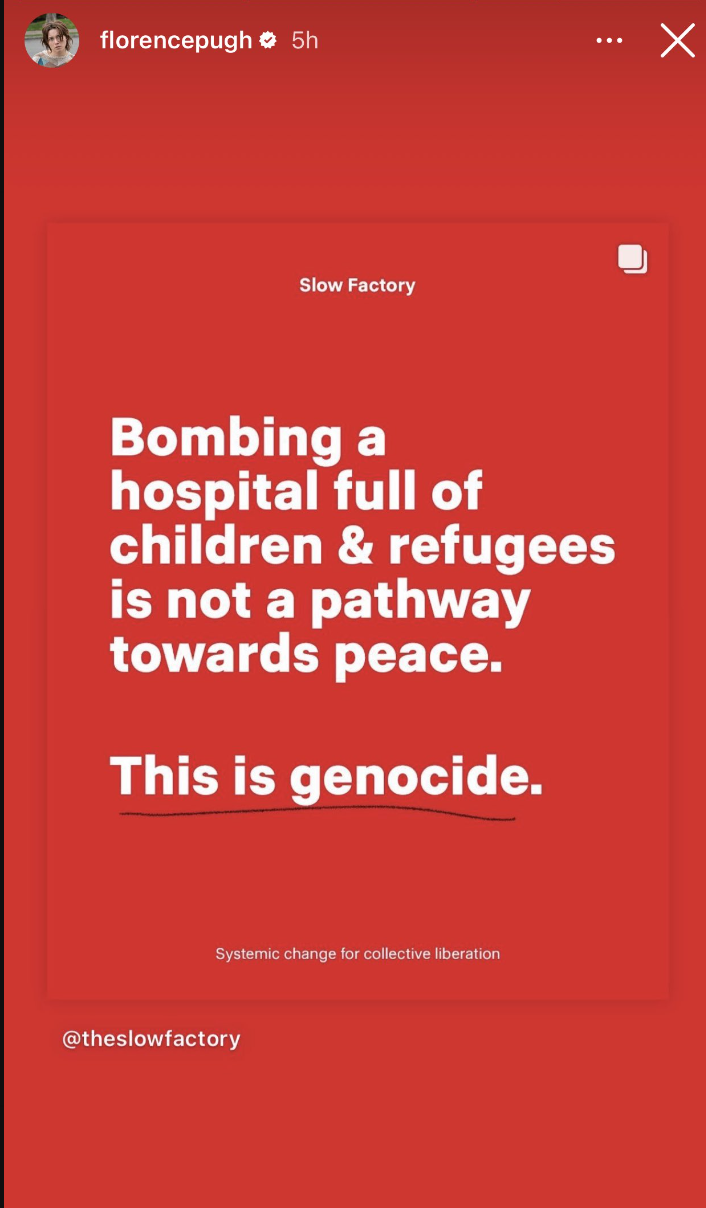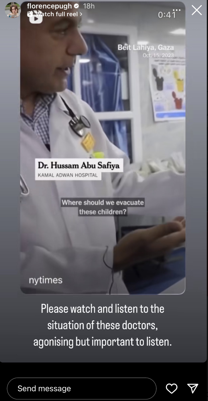 ونشرت فلورنس بيو، عدة صور من حادث قصف مستشفي المعمدانى، في غزة، عبر خاصية الاستوري في حسابها الرسمي علي موقع الصور والفيديوهات “انستجرام"، وعلقت علي إحدي الصور قائلة:"إن قصف مستشفى مليء بالأطفال، واللاجئين ليس طريقًا للسلام، بل إنها إبادة جماعية".