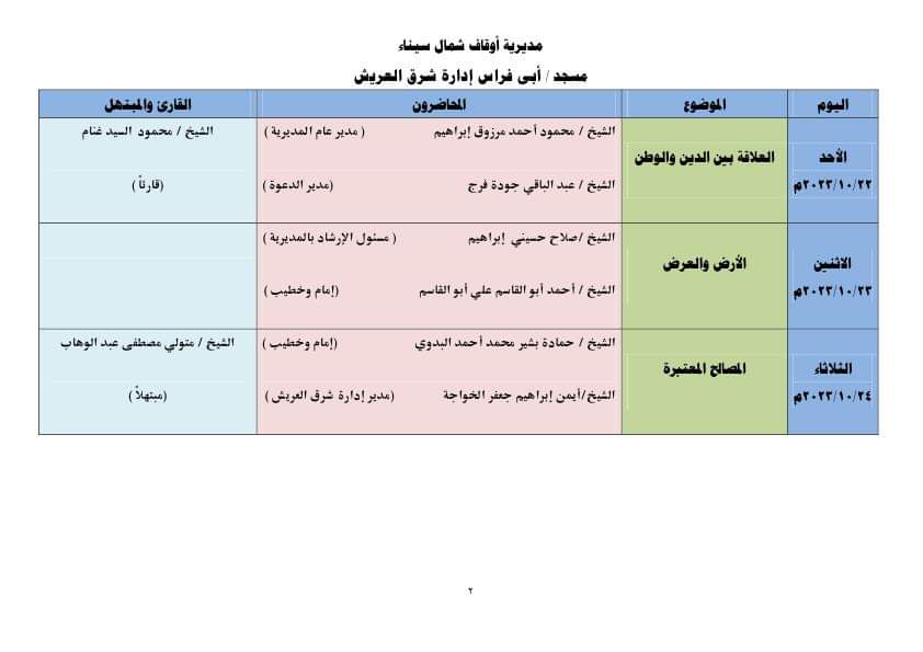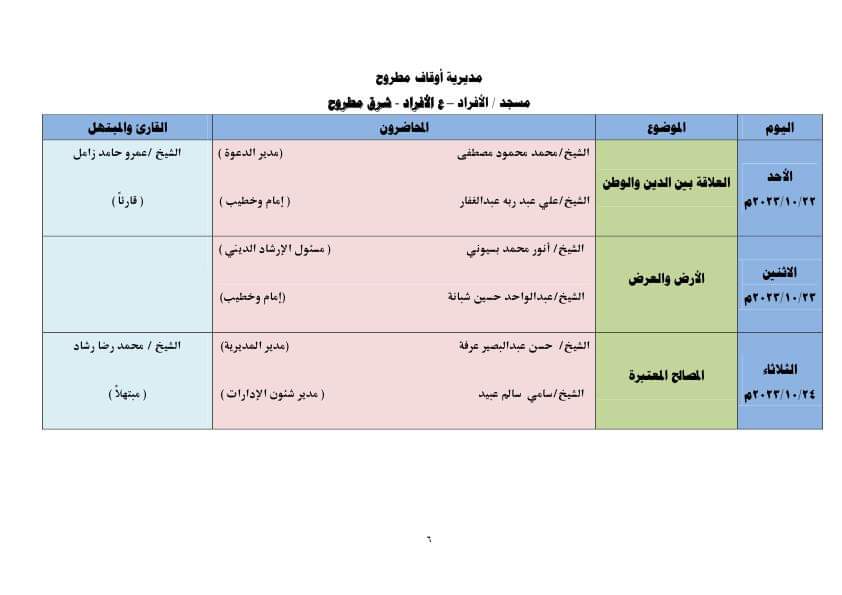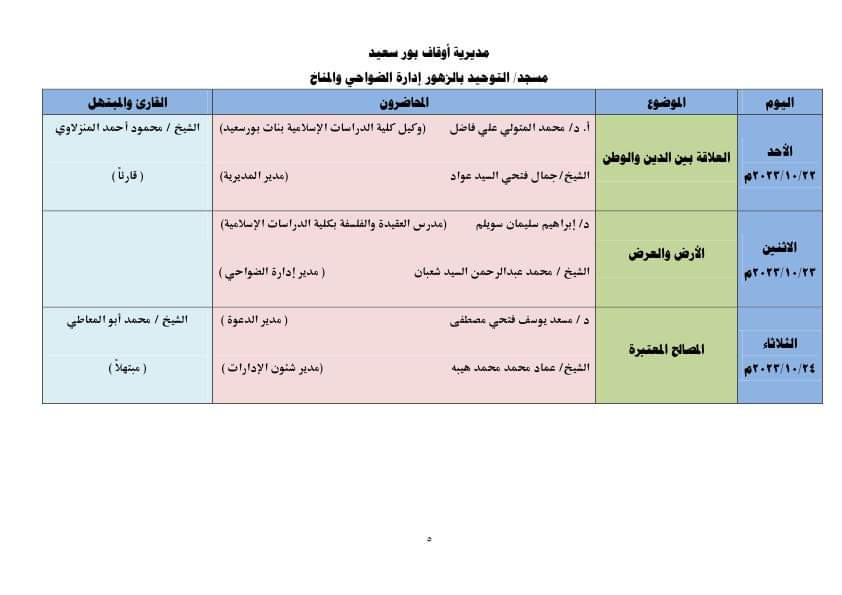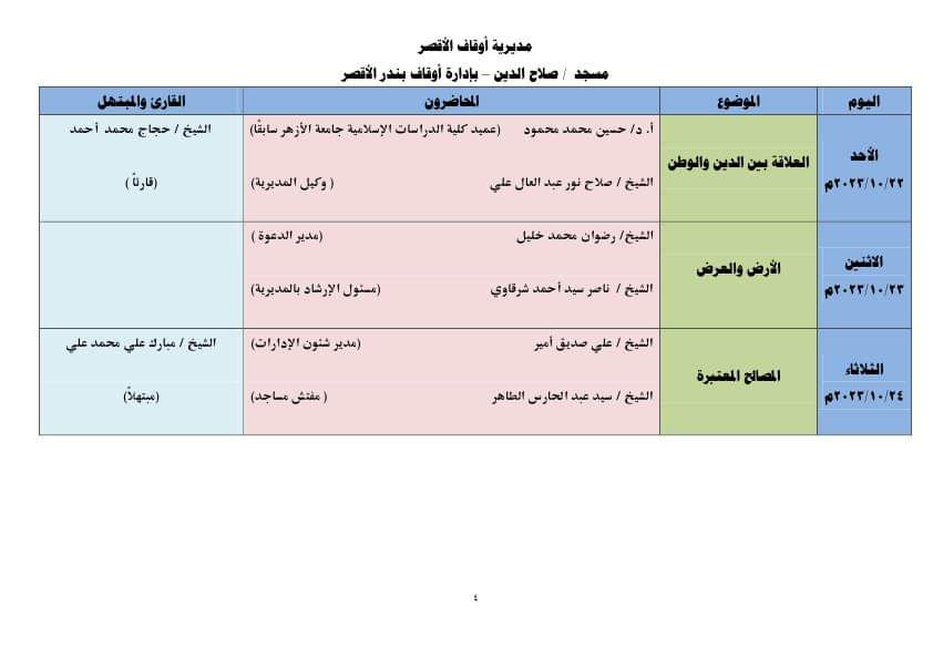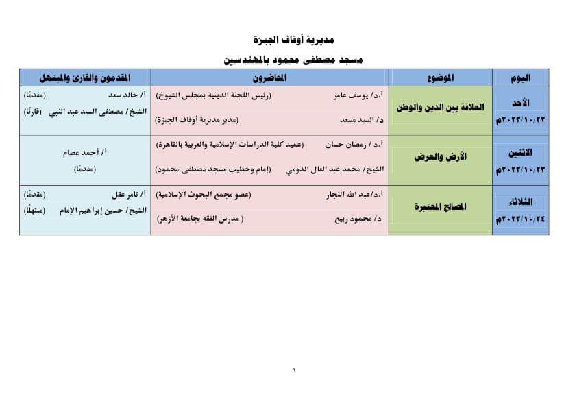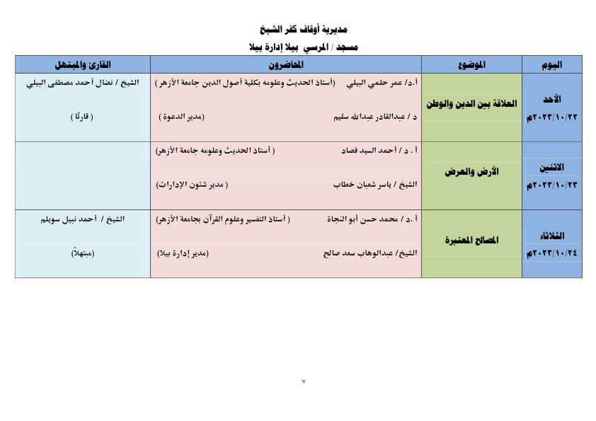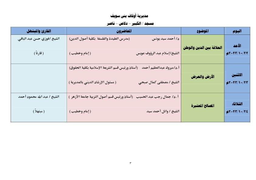 تنظم وزارة الأوقاف الأسبوع الثقافي في سبع محافظات في وقت واحد، وهي: (الجيزة، شمال سيناء، بني سويف، الأقصر، بورسعيد، مطروح، كفر الشيخ)، تحت عنوان: "الدفاع عن الأوطان" الأسبوع القادم من الأحد 22/ 10/ 2023م حتى الثلاثاء 24/ 10/ 2023م.