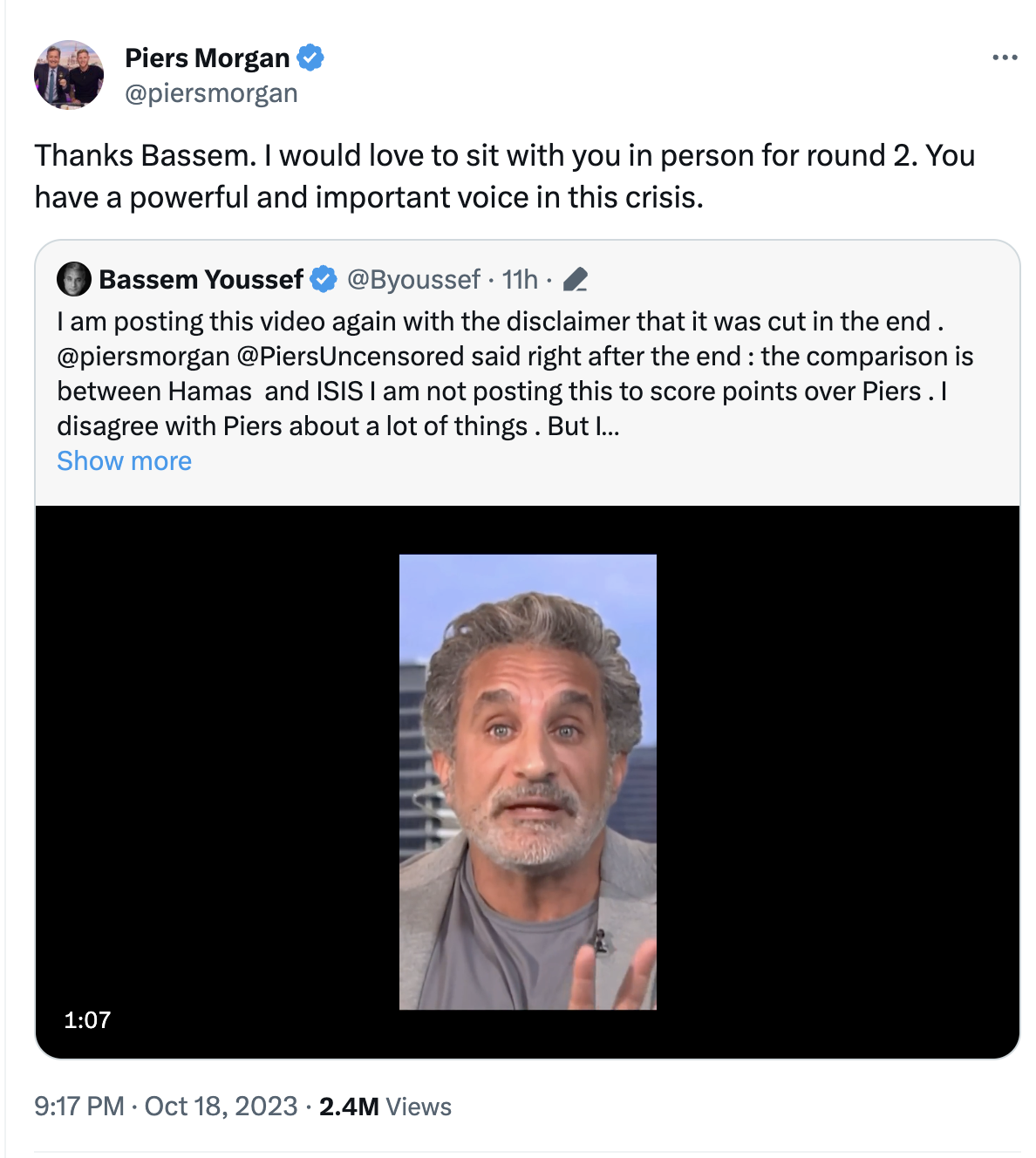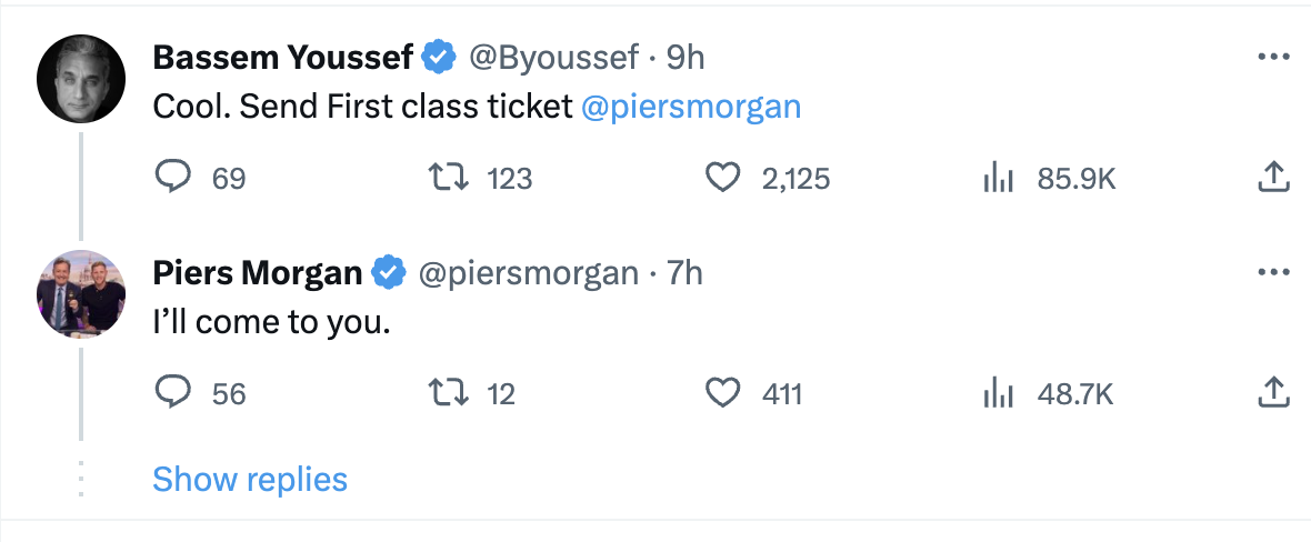 وجاء ذلك بعد منشور، نشره باسم علي موقع “اكس”، يؤكد فيه علي احترامه لبيرس مورجان، ولكنه يحترمه، قائلا:" أنا لا أنشر هذا من أجل تسجيل نقاط على بيرس، أنا لا أتفق مع بيرس حول الكثير من الأشياء... لكنني أحترمه في قدرته علي استضافة، الأشخاص ذوي الآراء المتعارضة، ومنحهم مساحة للتحدث، على الرغم من المحادثات الساخنة، والمقاطعات… بيرس: لا يعجبني رأيك ولكني أحترمك، آسف لسوء الفهم... ادعوني إلى لندن لإجراء مقابلة في الاستوديو،. أنا أطير على الدرجة الأولى.. من يريد رؤية هذا؟"، ليرد عليه بيرس بانه هو من سيذهب إليه في أمريكا للقائه.
