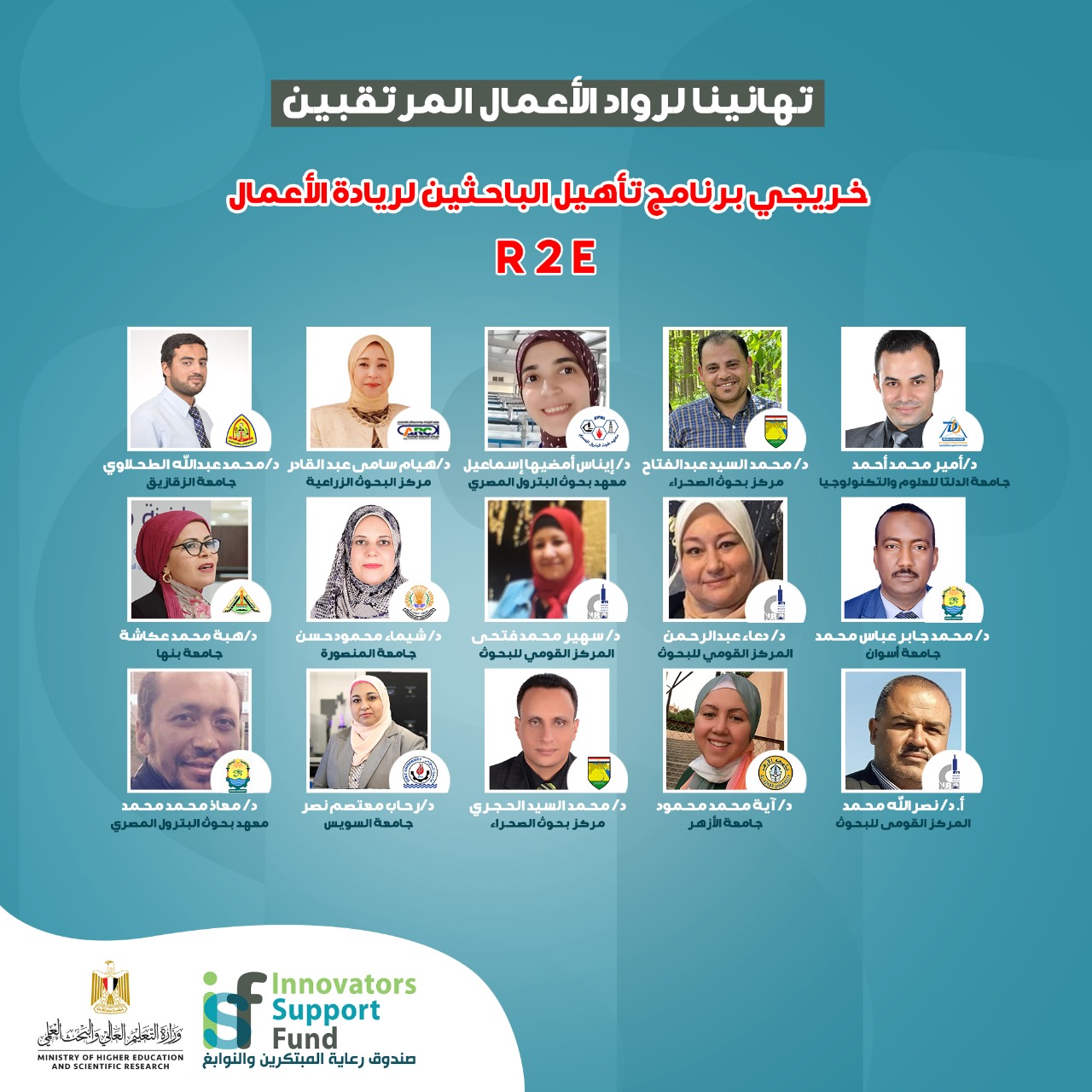 وأكد د.ضياء خليل المدير التنفيذي لصندوق رعاية المبتكرين والنوابغ أهمية هذا البرنامج وما حققه من نجاح كبير في دورته الأولى، مشيرًا إلى تقدم 156 باحثًا من 33 جامعة ومركزًا بحثيًّا، وقد نُفذ البرنامج على مرحلتين، المرحلة الأول (R2E: Base camp) أُقيمت في أسبوعين، نُظم خلالهما 4 ورش عمل تدريبية عن المبادئ الأساسية لريادة الأعمال، وكيفية تحويل البحث إلى منتج وشركة ناشئة، بمشاركة 41 باحثًا من 16 جامعة ومركزًا بحثيًّا (القاهرة، عين شمس، الأزهر، أسوان، بنها، المنصورة، السويس، الزقازيق، الدلتا للعلوم والتكنولوجيا، مركز بحوث وتطوير الفلزات، المعهد القومي للبحوث الفلكية والجيوفيزيقية، مدينة الأبحاث العلمية والتطبيقات التكنولوجية، مركز بحوث الصحراء، معهد بحوث البترول المصري، الهيئة القومية للاستشعار من البُعد وعلوم الفضاء، المركز القومي للبحوث).