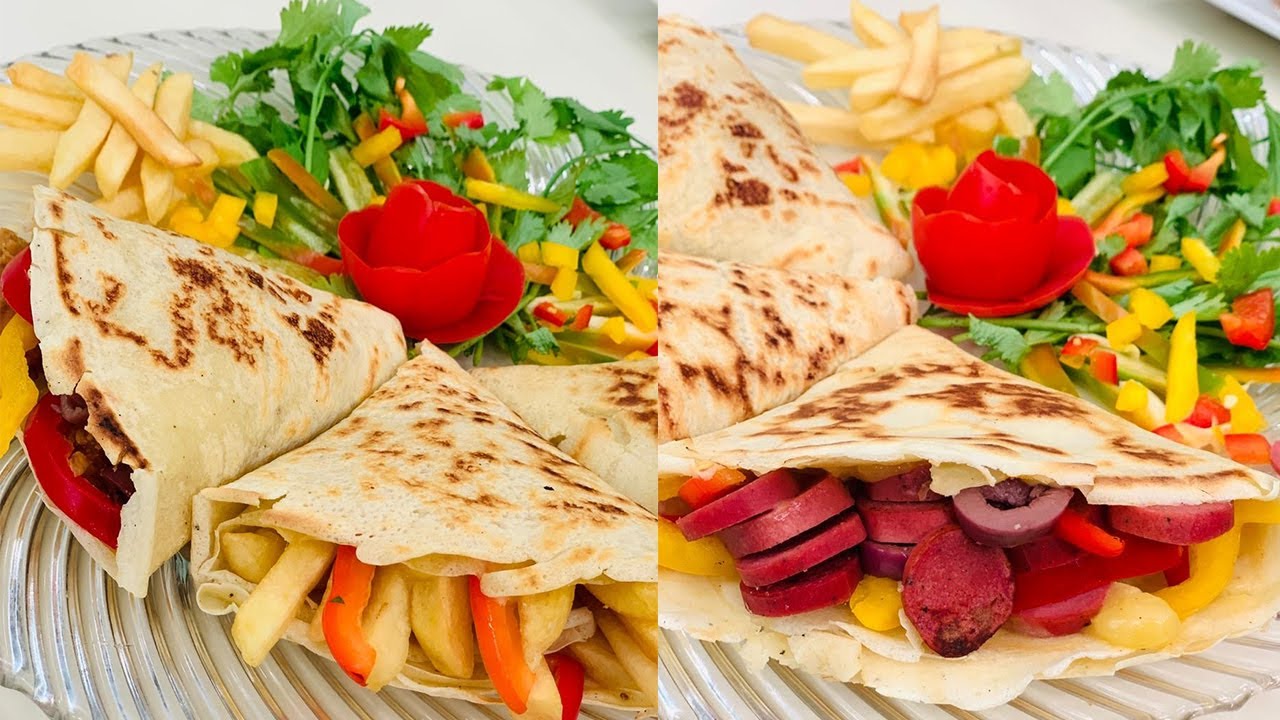 - ثم ندهنه بالكاتشب والمايونيز ونضيف الخضروات واللحوم والجبن ونغلق الكريب على شكل مثلث.