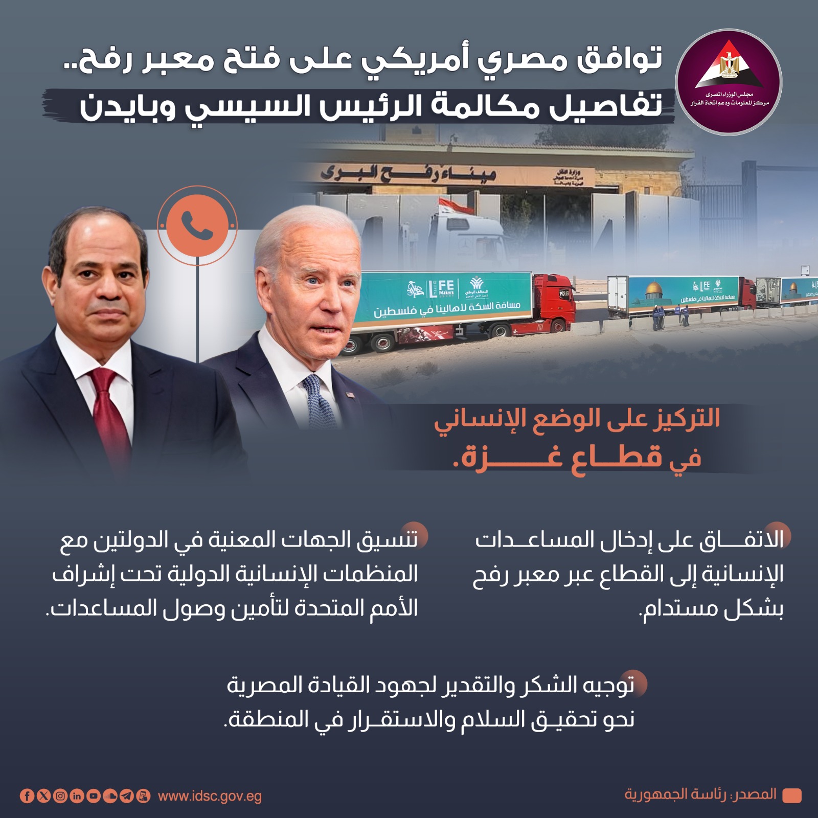 الرئيس السيسي وبايدن، نشرت الصفحة الرسمية لمركز المعلومات ودعم اتخاذ القرار بمجلس الوزراء على موقع التواصل الاجتماعي فيسبوك انفوجراف جديد تحت “عنوان توافق مصري أمريكي على فتح معبر رفح، تفاصيل مكالمة الرئيس السيسي وبايدن”.