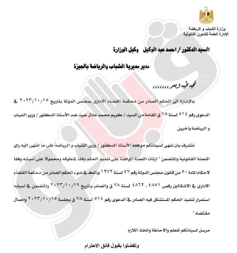 وجاء استبعاد حسام المندوه بعد خطاب من الشئون القانونية في وزارة الشباب والرياضة إلى مديرية الشباب والرياضة بالجيزة، تؤكد خلاله ضرورة استبعاد المندوه وتنفيذ الحكم الصادر باستبعاده من القضاء الإداري في الدعوى المقامة من كريم عادل عبيد.
