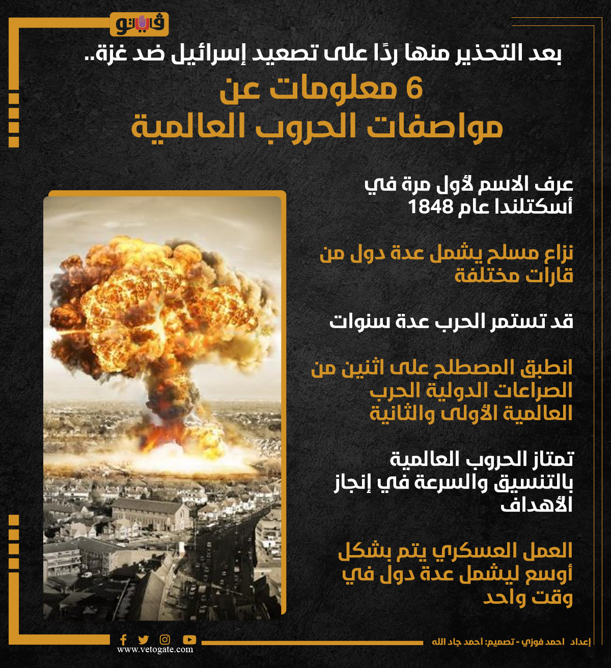 بعد التحذير منها ردًا على تصعيد إسرائيل ضد غزة.. 6 معلومات عن مواصفات الحروب العالمية (إنفوجراف) الثلاثاء 14/نوفمبر/2023 - 12:08 م 11/14/2023 12:08:59 PM صورة أرشفية، فيتو احمد فوزي شارك طباعة 18 حجم الخط شارك طباعة