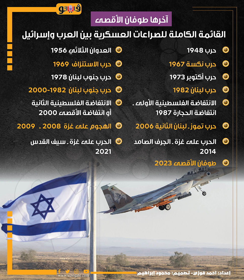 آخرها طوفان الأقصى، القائمة الكاملة للصراعات العسكرية بين العرب وإسرائيل (إنفوجراف) السبت 21/أكتوبر/2023 - 06:14 م 10/21/2023 6:14:29 PM صورة أرشيفية، فيتو احمد فوزي شارك طباعة 18 حجم الخط شارك طباعة