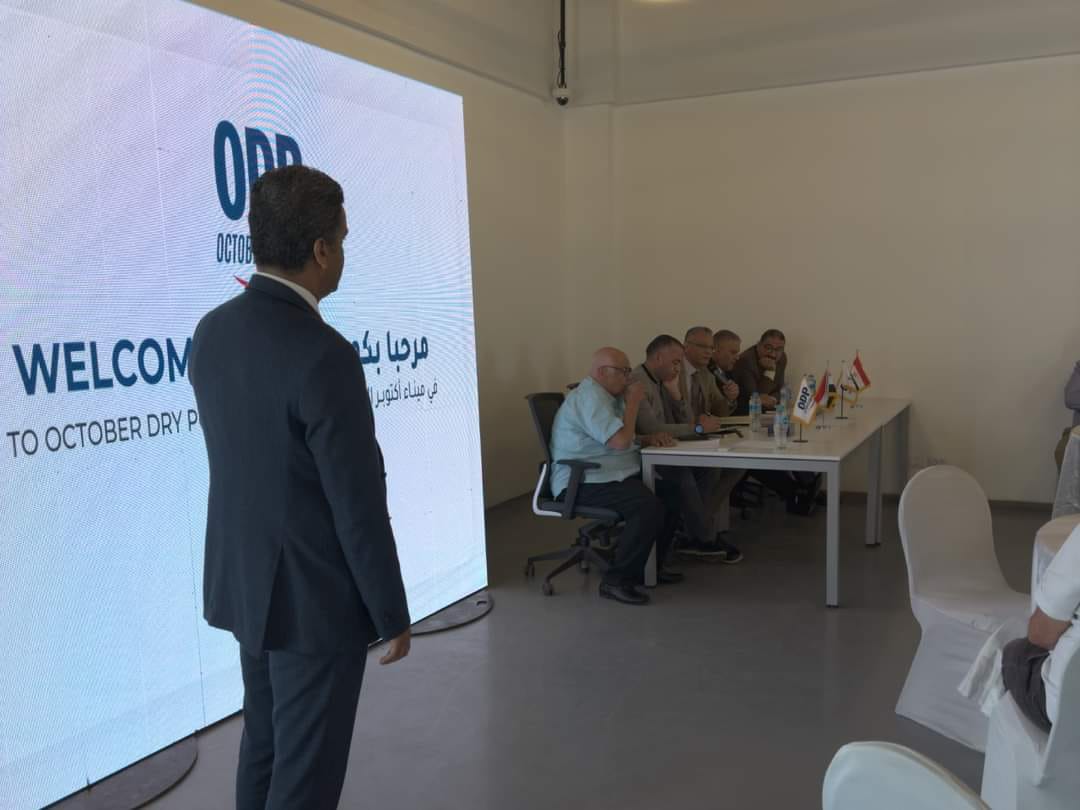 واستهدف الاجتماع التعرف علي الخدمات والمميزات والمرافق المتطورة بميناء أكتوبر الجاف مسلطين الضوء على الخدمات الرئيسية التي يقدمها ميناء أكتوبر الجاف والتى تقدم بالعملة المحلية المصرية.