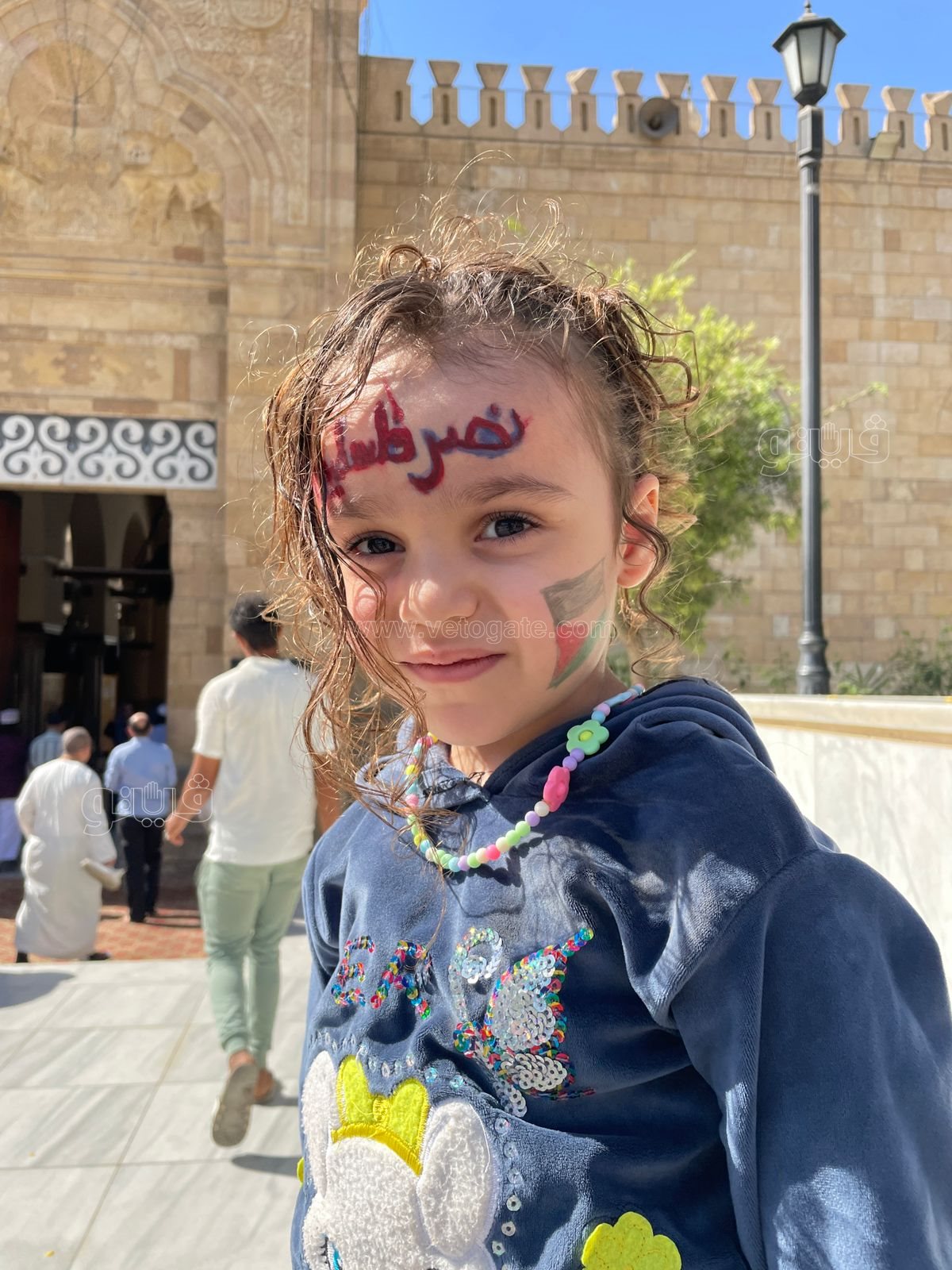 تزينت طفلة قبل صلاة الجمعة من داخل ساحة مسجد الأزهر بكتابة عبارة "نصر فلسطين" على وجهها دعمًا للقضية الفلسطينية بعد الأحداث الأخيرة بالأراضي المحتلة والعدوان الإسرائيلي الغاشم.