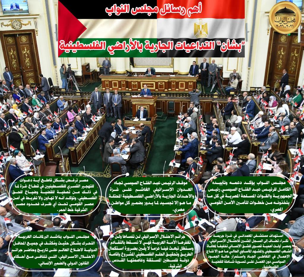 مجلس النواب يناشد البرلمانات العربية التحرك بشكل حثيث ومُكثف في جميع المحافل الدولية لاطلاع العالم على تاريخ وحاضر جرائم الاحتلال الاسرائيلي، التي تتنافى مع أحكام القانون الدولي والضمير الإنساني.