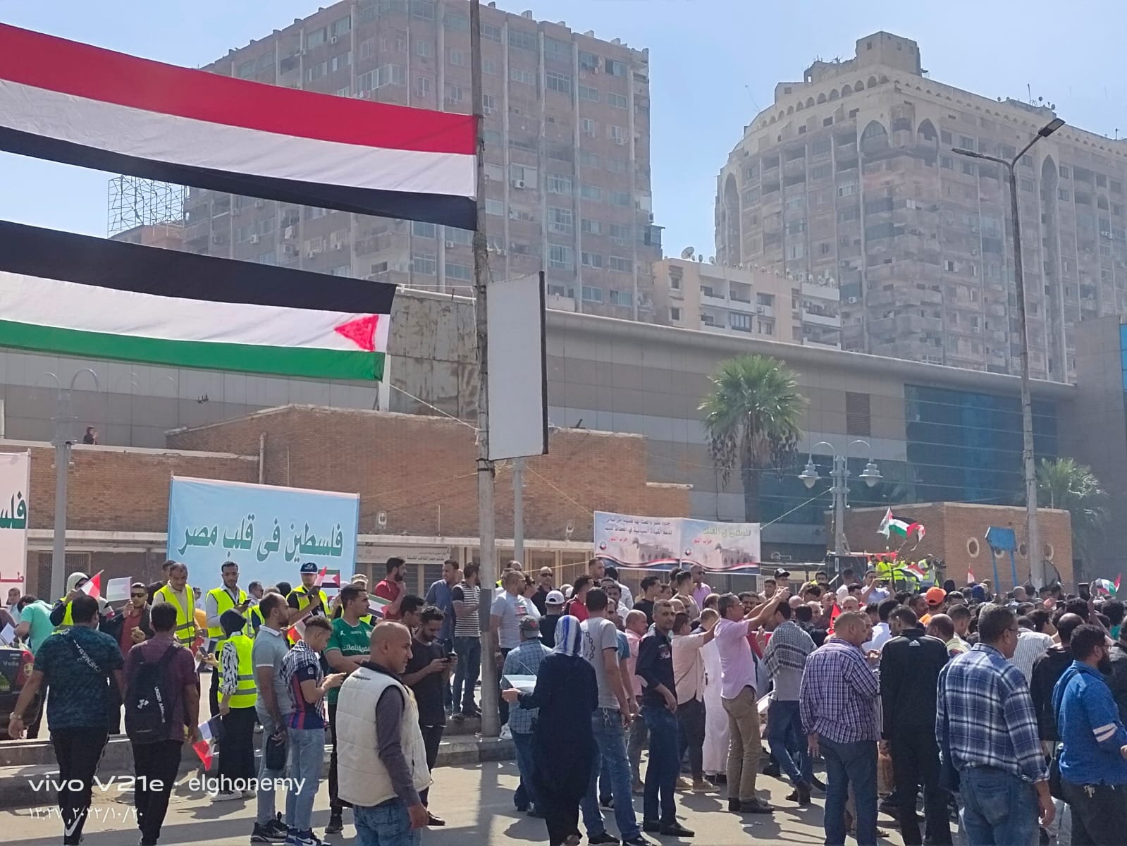 ورفعوا أعلام مصر وفلسطين ولافتات فلسطين في القلب ولا لتهجير الفلسطينيين، ودعم للرئيس ومن المقرر أن يشهد الميدان مظاهرة عقب صلاة الجمعة.